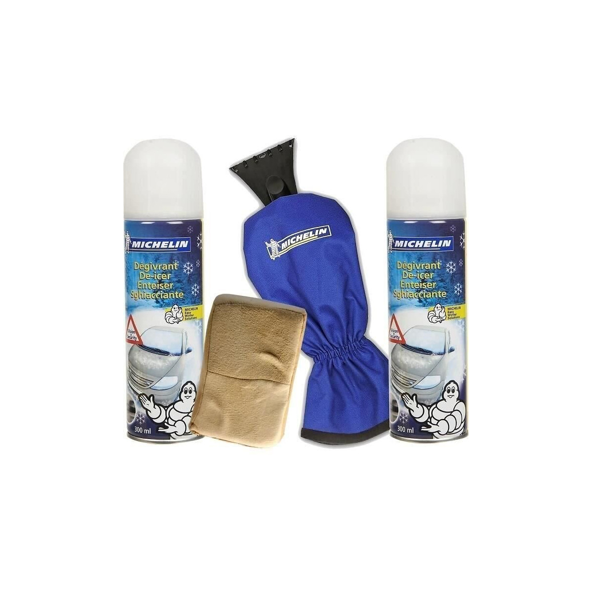Pack hiver Michelin, le choix de l'efficacité ! Coffret comprenant 2 dégivrants aérosol 300 ml, une éponge chamoisée vitre, et une raclette en polycarbonate incassable avec une racloir 10 cm.