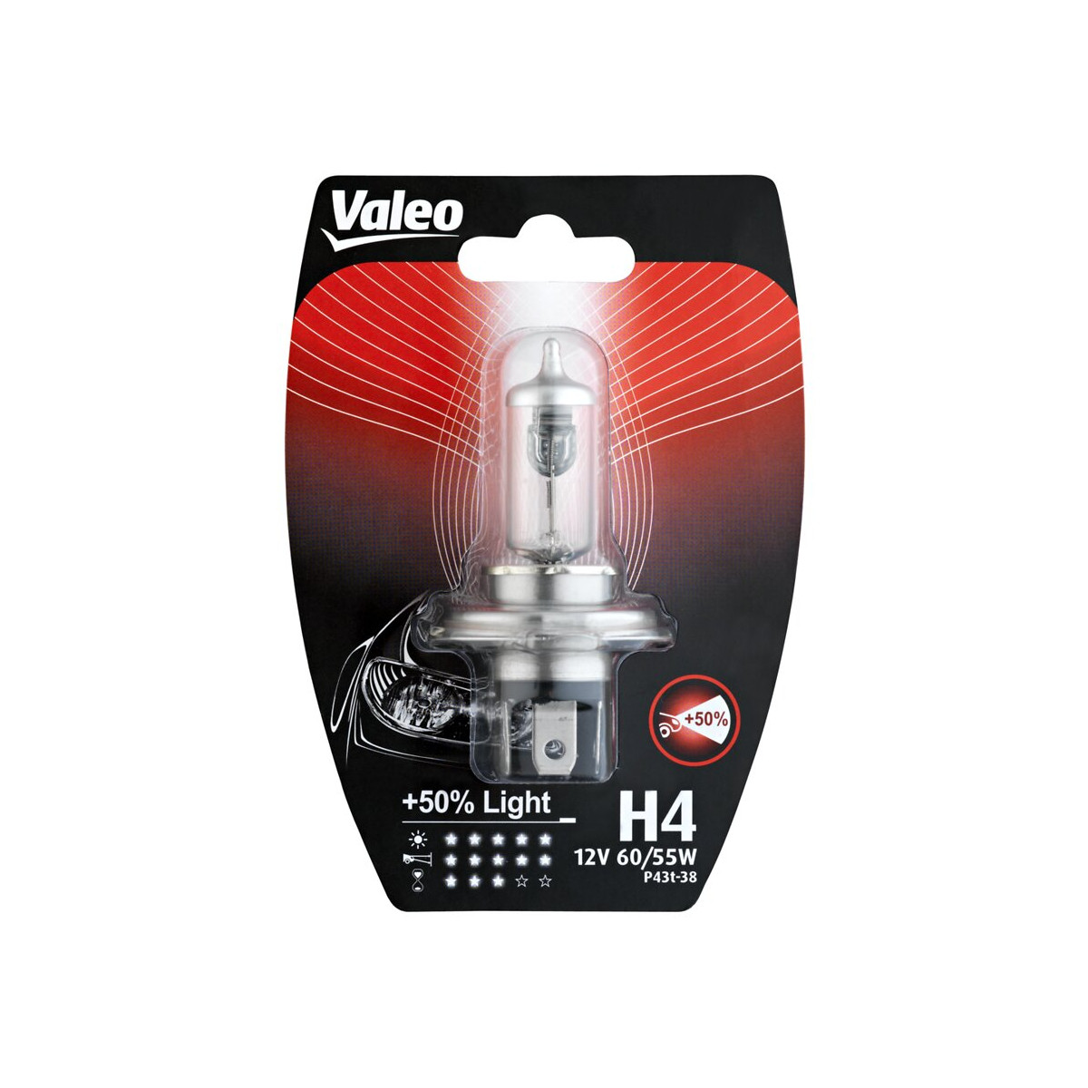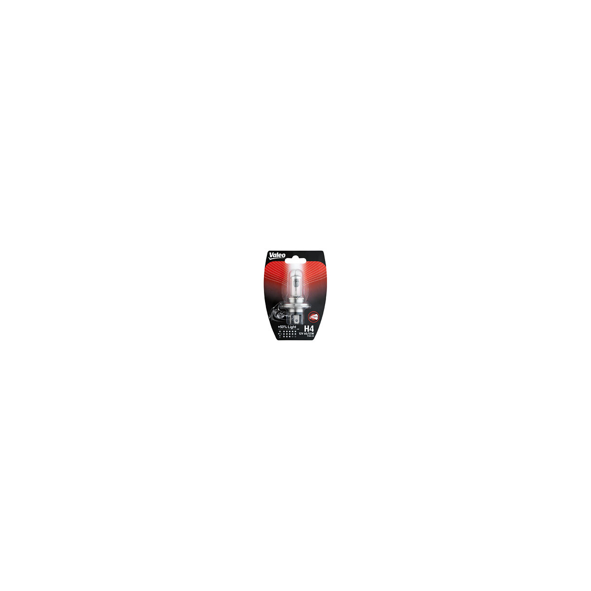 Avec les ampoules Halogène Valeo plus 50 pour cent Light, bénéficiez d’une augmentation de 50 pour cent de la distance d'éclairage pour une meilleure visibilité et une conduite en toute sécurité. Cette gamme est particulièrement recommandée aux personnes voyageant beaucoup ou aux conducteurs empruntant principalement les autoroutes. De cette façon, votre conduite sera plus confortable et vous apportera plus de sécurité. Avantages : - Meilleure visibilité et augmentation de la distance d'éclairage. - Une conduite nocturne plus sûre. - Durée de vie renforcée, pour un plus grand plaisir de conduite. - Certification aux normes ECE R37 et 100% conforme aux usages sur la voie publique. Caractéristiques : - Type ECE : H4. - Voltage : 12 V. - Watt : 60/55 W. - Type de culot : P43t-38. Plus de 40 pour cent des accidents de la route ont lieu de nuit bien que le trafic soit 10 fois moins dense qu'en journée : la qualité de vos ampoules est un facteur clé de sécurité. Valeo propose une gamme complète de produits d'éclairage : projecteurs, antibrouillards, éclairages d'intérieur, clignotants pour couvrir tous les besoins du marché. Nous vous proposons différents types de lampes halogènes afin que vous puissiez choisir celle qui correspond le mieux à vos besoins.