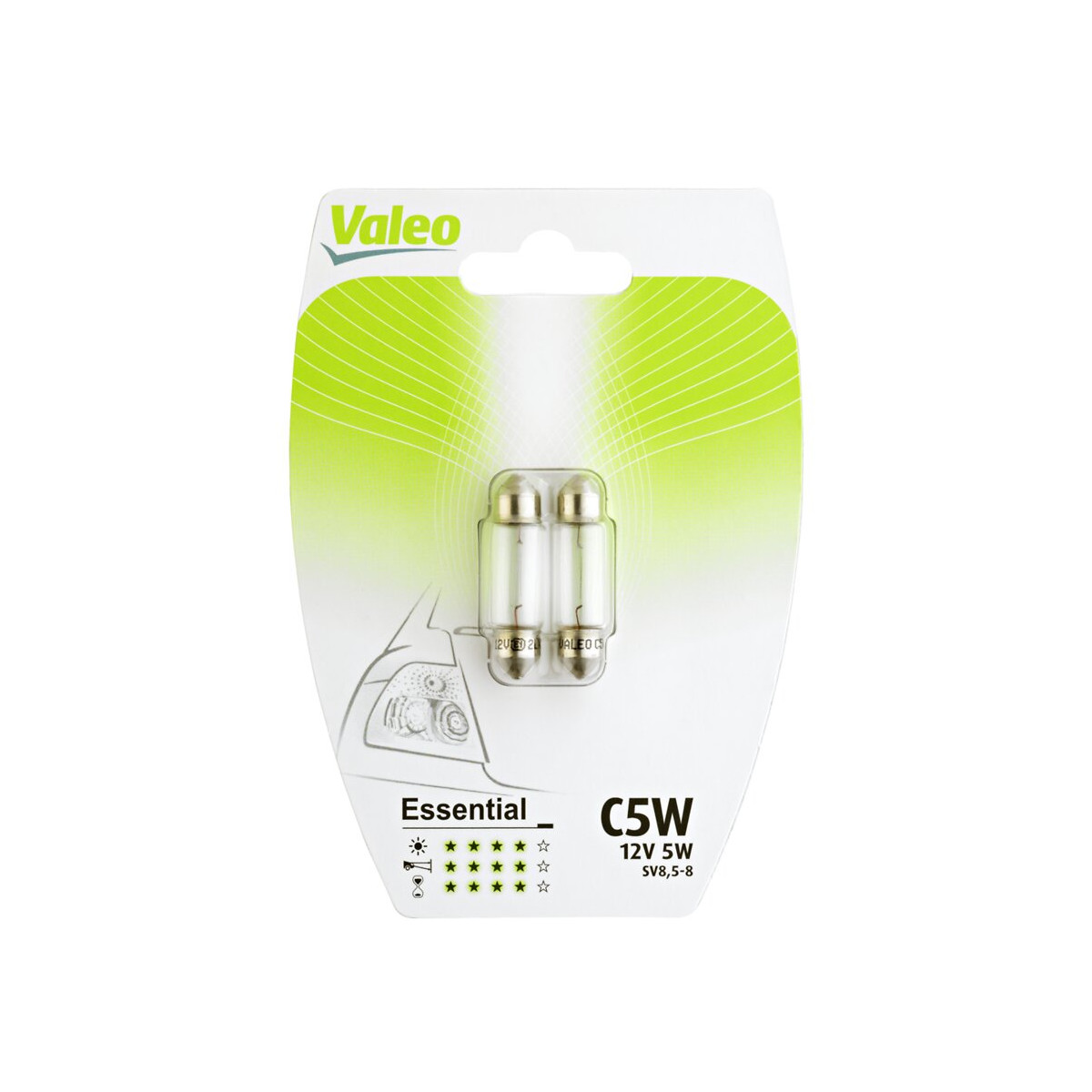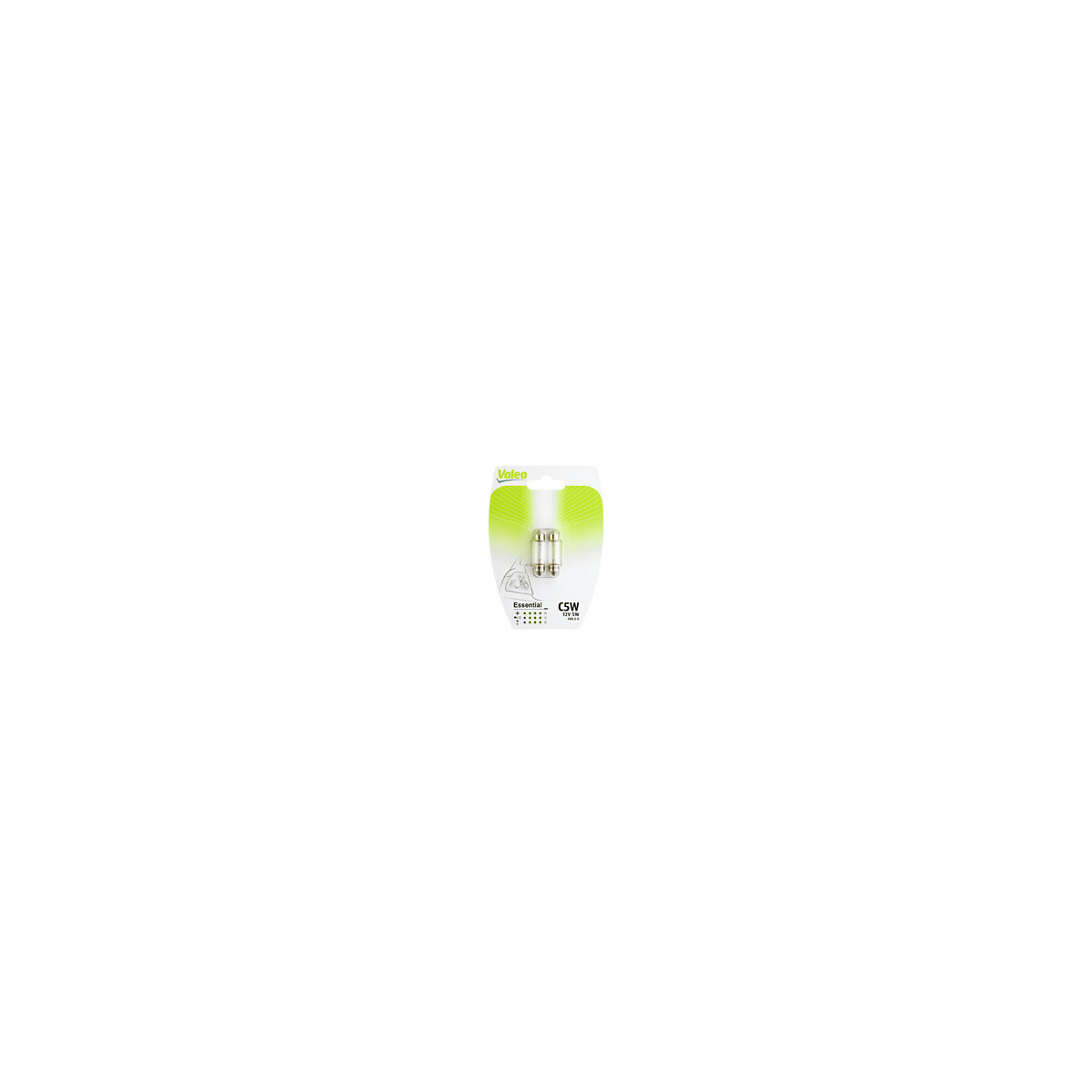 Les ampoules de signalisation Valeo Essential sont idéales pour une utilisation fiable à l'extérieur du véhicule (feu de recul, clignotant, feu de brouillard arrière, feu de stationnement, feu éclaireur de plaque). Avantages : - Durée de vie renforcée. - Certification aux normes ECE R37 et 100% conforme aux usages sur la voie publique. Caractéristiques : - Type ECE : C5W. - Voltage : 12 V. - Watt : 5 W. - Type de culot : SV8,5. - Quantité : 2. Plus de 40% des accidents de la route ont lieu de nuit bien que le trafic soit 10 fois moins dense qu'en journée : la qualité de vos ampoules est un facteur clé de sécurité. Valeo propose une gamme complète de produits d'éclairage : projecteurs, antibrouillards, éclairages d'intérieur, clignotants pour couvrir tous les besoins du marché. Nous vous proposons différents types de lampes halogènes afin que vous puissiez choisir celle qui correspond le mieux à vos besoins.