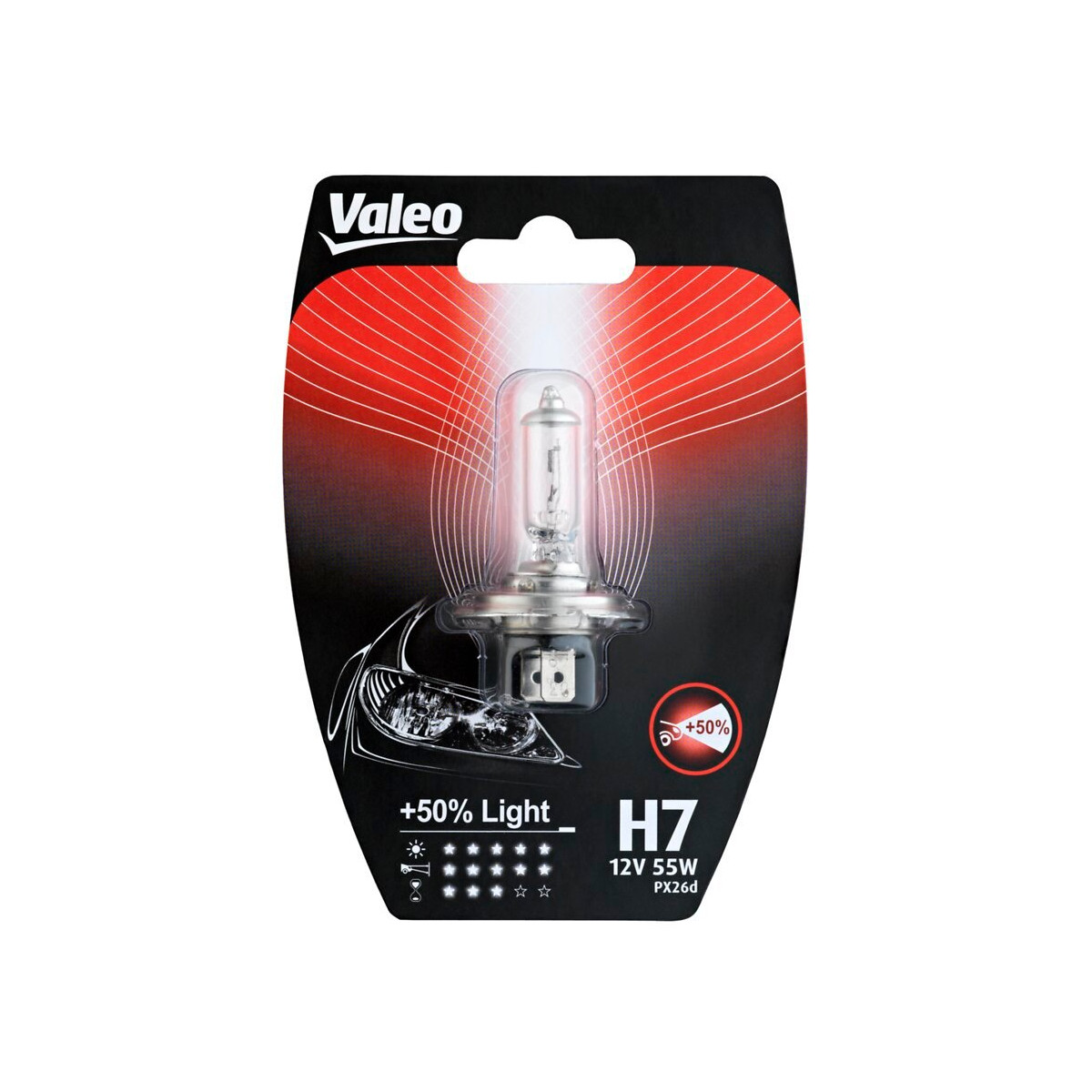 Avec les ampoules Halogène Valeo plus 50 pour cent Light, bénéficiez d’une augmentation de 50 pour cent de la distance d'éclairage pour une meilleure visibilité et une conduite en toute sécurité. Cette gamme est particulièrement recommandée aux personnes voyageant beaucoup ou aux conducteurs empruntant principalement les autoroutes. De cette façon, votre conduite sera plus confortable et vous apportera plus de sécurité. Avantages : - Meilleure visibilité et augmentation de la distance d'éclairage. - Une conduite nocturne plus sûre. - Durée de vie renforcée, pour un plus grand plaisir de conduite. - Certification aux normes ECE R37 et 100% conforme aux usages sur la voie publique. Caractéristiques : - Type ECE : H7. - Voltage : 12 V. - Watt : 55 W. - Type de culot : PX26d. Plus de 40 pour cent des accidents de la route ont lieu de nuit bien que le trafic soit 10 fois moins dense qu'en journée : la qualité de vos ampoules est un facteur clé de sécurité. Valeo propose une gamme complète de produits d'éclairage : projecteurs, antibrouillards, éclairages d'intérieur, clignotants pour couvrir tous les besoins du marché. Nous vous proposons différents types de lampes halogènes afin que vous puissiez choisir celle qui correspond le mieux à vos besoins.
