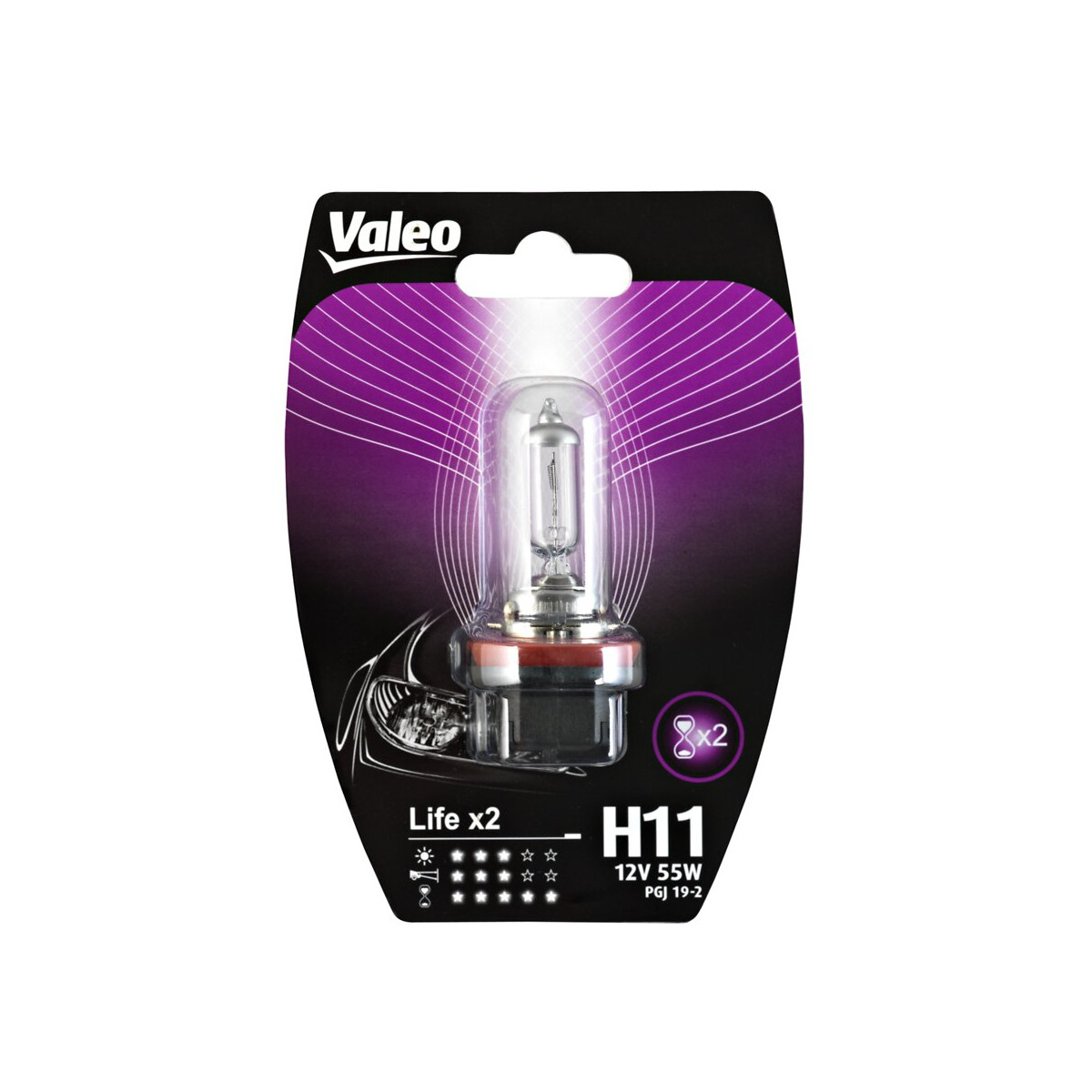 La - Durée de vie des ampoules Halogène Valeo Life x2 est considérablement améliorée (doublée) par rapport aux ampoules standard. Avec cette technologie, vous remplacez vos ampoules moins fréquemment. Ainsi, vous êtes respectueux de l'environnement et économisez de l'argent. Avantages : - Forte puissance lumineuse. - Visibilité accrue et une conduite nocturne plus sûre. - Durée de vie renforcée, pour un plus grand plaisir de conduite. - Certification aux normes ECE R37 et 100% conforme aux usages sur la voie publique. Caractéristiques : - Type ECE : H11. - Voltage : 12 V. - Watt : 55 W. - Type de culot : PGJ19-2. Plus de 40 pour cent des accidents de la route ont lieu de nuit bien que le trafic soit 10 fois moins dense qu'en journée : la qualité de vos ampoules est un facteur clé de sécurité. Valeo propose une gamme complète de produits d'éclairage : projecteurs, antibrouillards, éclairages d'intérieur, clignotants pour couvrir tous les besoins du marché. Nous vous proposons différents types de lampes halogènes afin que vous puissiez choisir celle qui correspond le mieux à vos besoins.