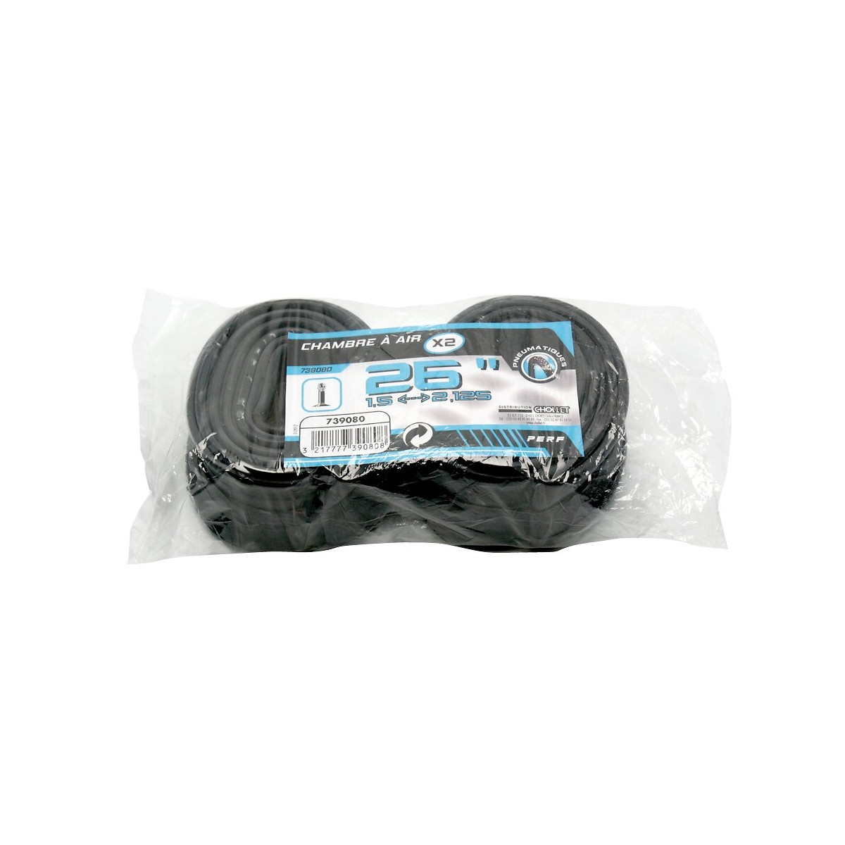 Lot de 2 chambres à air 26" x 1,50 jusqu'à 2,00. Grosse valve type Schrader filmées.