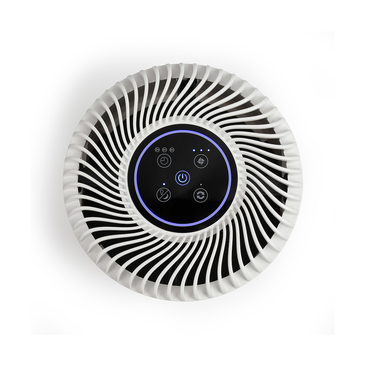 dom441 - Pour un air meilleur, dans votre intérieur. Le purificateur d'air dispose d?une taille ultra compacte, lui permettant de trouver sa place dans n'importe quelle pièce de la maison sans prendre de place. L'appareil couvre une surface de 12m², ce qui sera idéal pour purifier les chambres et respirer un air plus sain. Conçu pour être utilisé au quotidien, l'appareil dispose d'un minuteur programmable sur 2/4/8 heures ainsi que d'un mode nuit silencieux, vous permettant de l'utiliser la nuit tout en dormant paisiblement. Avec un débit d'air purifié (CADR) de 80 m?/h, le purificateur dispose d'un rendement performant afin d'assainir l'air de façon efficace. De plus, l'appareil dispose de 3 niveaux de filtration pour capter les différentes impuretés présentes dans l'air : - Le préfiltre : permettant de filtrer les particules telles que la poussière et les saletés afin d'éviter l'encrassement du filtre. - Le filtre au charbon actif : éliminant les mauvaises odeurs, les gaz nocifs et composés organiques volatiles etc... - Le filtre HEPA 11 : filtrant les particules fines, le pollen, la fumée et les allergènes en suspension dans l'air. Enfin, le filtre dispose d'une longue durée de vie (1000 h) et devra donc être remplacé environ tous les 4 mois pour une utilisation de 8h par jour. - Puissance : 7.5 W 3 niveaux de filtration : préfiltre, filtre à charbon actif et filtre HEPA Surface couverte jusqu'à 12² Minuteur 2/4/8 heures et arrêt automatique 2 vitesses Mode et lumière nuit Indicateur de changement de filtre Sortie d'air à 360° Mode nuit pour un fonctionnement silencieux Durée de vie du filtre : 1000 heures Le pré-filtre permet de filtrer les grosses particules comme la poussière et les saletés. Le filtre HEPA 11 filtre les particules plus fines comme le pollen, la fumée, les allergènes Le filtre au charbon actif élimine les mauvaises odeurs, les gaz nocifs, etc. Débit d'air : 80 m3/h (CADR (particules) Niveau sonore : jusqu'à 57 dB Dimensions : 20 x 20 x 25.2 cm Poids : 1.8 kg Couleur : blanc