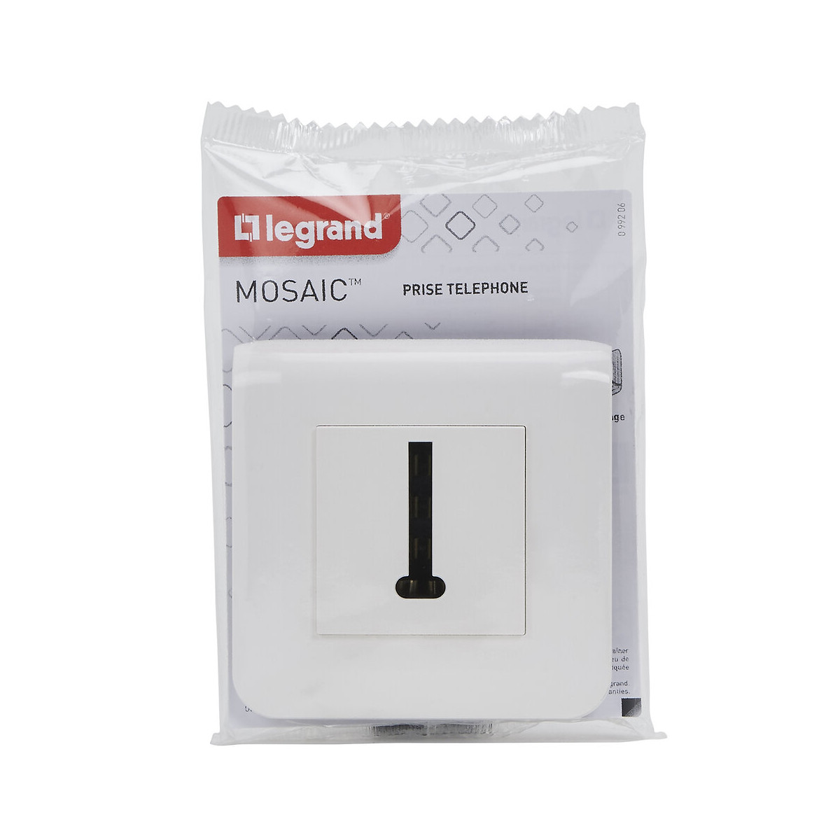 Prise téléphone en T Mosaic blanc avec plaque. Cette prise permet de raccorder au réseau téléphonique les appareils disposant d'une fiche téléphone en T. Livré complet avec plaque et support : prêt à installer.Spécifications techniques