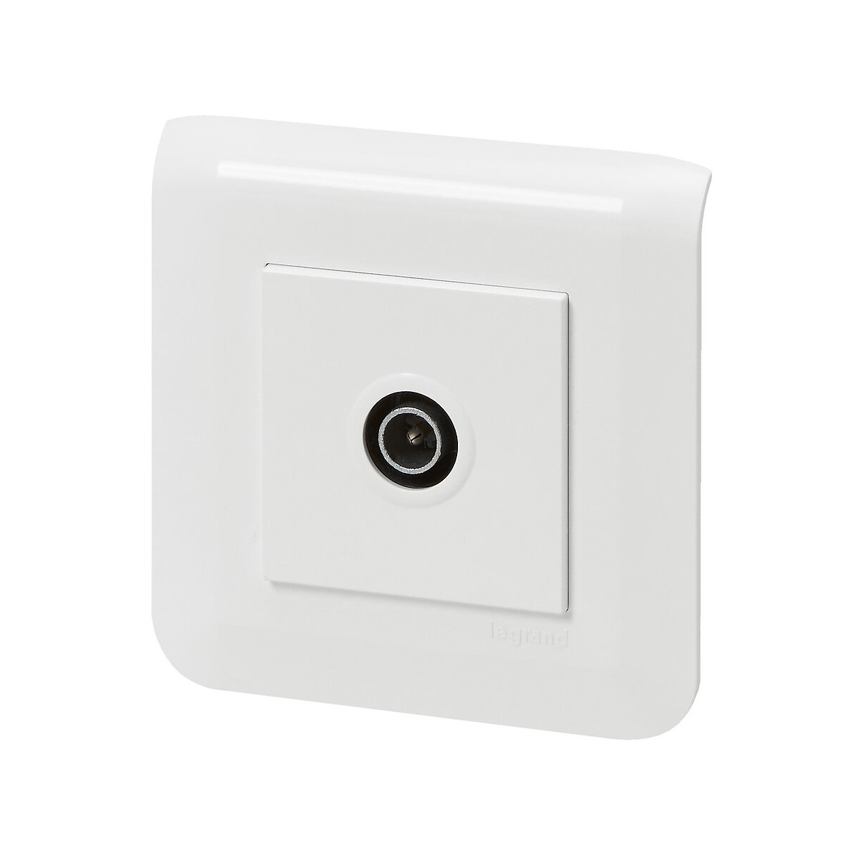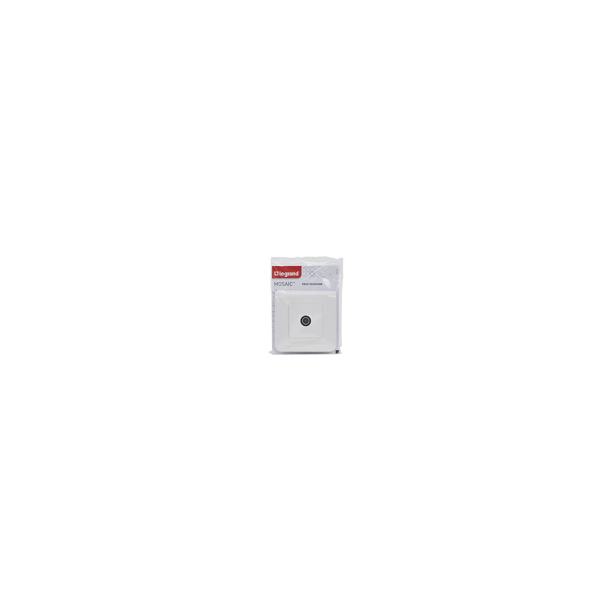 Prise TV Mosaic simple mâle blanc avec plaque. Cette prise TV simple répond au besoin de branchement de tous types de téléviseurs avec une qualité ultra haute définition (UHD). Livré complet avec plaque et support : prêt à installer.Spécifications techniques