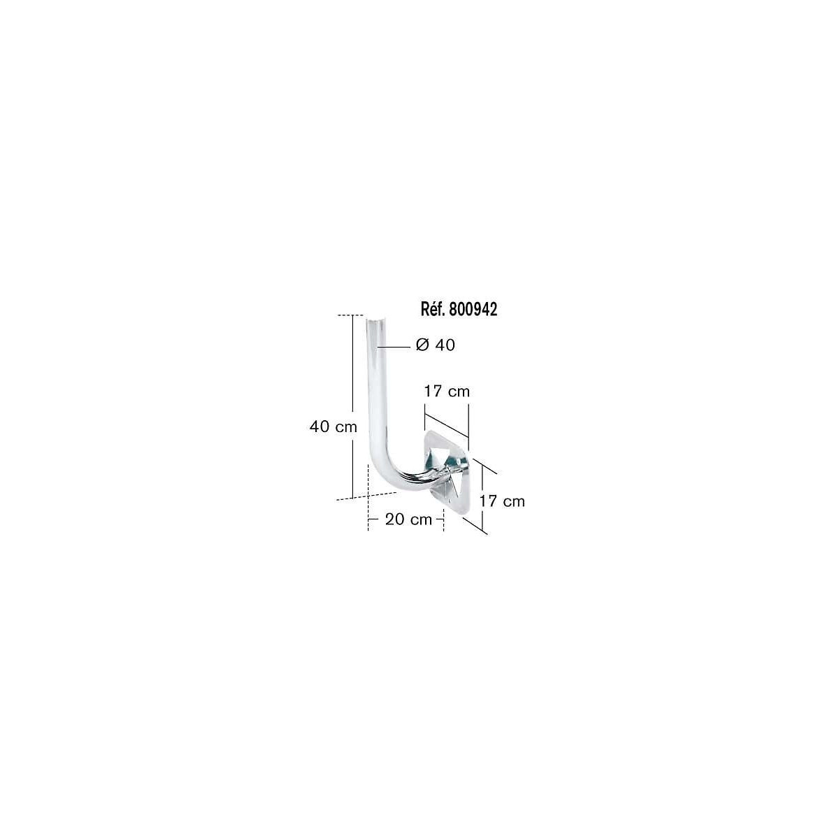 Compatibilité : Pour parabole jusqu'à Ø60 Diamètre (mm) : 40 Dimensions (mm) : Longueur : 200, Coude : 400 Matière : Tube acier Poids (kg) : 1.19 Type : Bras de déport mural