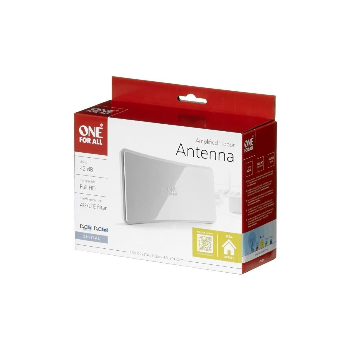 ONE FOR ALL SV9421 Antenne intérieure Curved 42dB blanche - Compatible TNT et radio numérique DAB+ - Câble d'antenne de 1.5 Metres inclus - Circuits électroniques maximales a un bruit faible de 4dB - Alimentation électrique par un transformateur avec 6VDC, 50mA AC/DC ou directement par le Décodeur TNT (DVB-T/T2) - Amplificateur intégré de 42dB - Interférence minimale grâce aux filtres actifs inclus