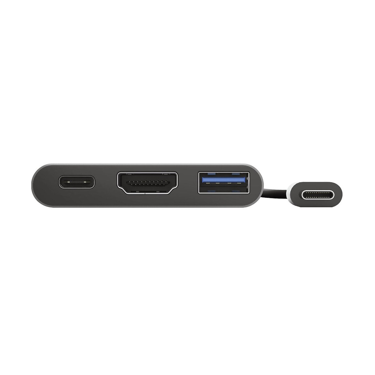Compatibilité : Ordinateur portable sous windows 10, MacBook sous macOS 10.11 ou version ultérieure, Tablette sous iOS ou Android Couleur : Gris Dimensions (mm) : 11 x 58 x 51 Divers : Adaptateur USB-C 3-en-1 pour ajouter des port USB et HDMI et un port charge de type C Type : Adaptateur Type d'USB : 3.2
