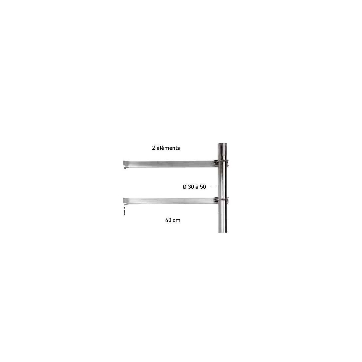 Compatibilité : Pour mâts Ø30 à 50 mm Dimensions (mm) : Longueur : 400 Matière : Zinc bleu Poids (g) : 1.5 Type : Paire de pattes à scellement extra-fortes