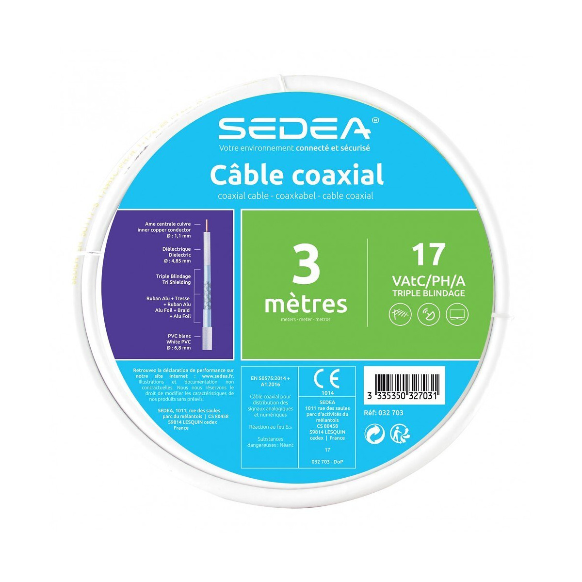Triple Blindage Qualité pro Classe 3Ghz Câble coaxial pour distribution des signaux analogiques et numériques. Qualité professionnelle. Ame centrale cuivre, diélectrique dia 4,85mm, Triple blindage Ruban Alu+Tresse+ ruban Alu.Réaction au feu Eca EN 50575:2014 + A1:2016 . Qualité professionnelle.Classe A 3 GHz. Pour une utilisation intérieure. Couleur: Blanc Section du fil (en mm²): 1 Type de conducteur: Cuivre Usage du produit: Câble extérieur pour systèmes de distribution destinés aux signaux de radiodiffusion sonores et de tv analogiques et numériques pour des fréquences d’utilisation comprises entre 5 Mhz et 3000 Mhz. Blindage: Triple Section (en mm): 1.1 Diamètre (en mm): 6.8 Matériau du conducteur: Cuivre Type de blindage: Aluminium Matière extérieure: PVC Nombre de fils: 1 Nom du câble: TV 17VATC triple blindage Longueur du câble (en m): 3 Conditionnement: En couronne Produit emballé : hauteur (en cm): 4 Produit emballé : largeur (en cm): 13 Produit emballé : profondeur (en cm): 13 Produit emballé : poids (en kg): 0.191 Indication du geste de tri (triman): Nos produits et emballages peuvent faire l'objet d'une consigne de tri. Pour en savoir plus : www.quefairedemesdechets.fr