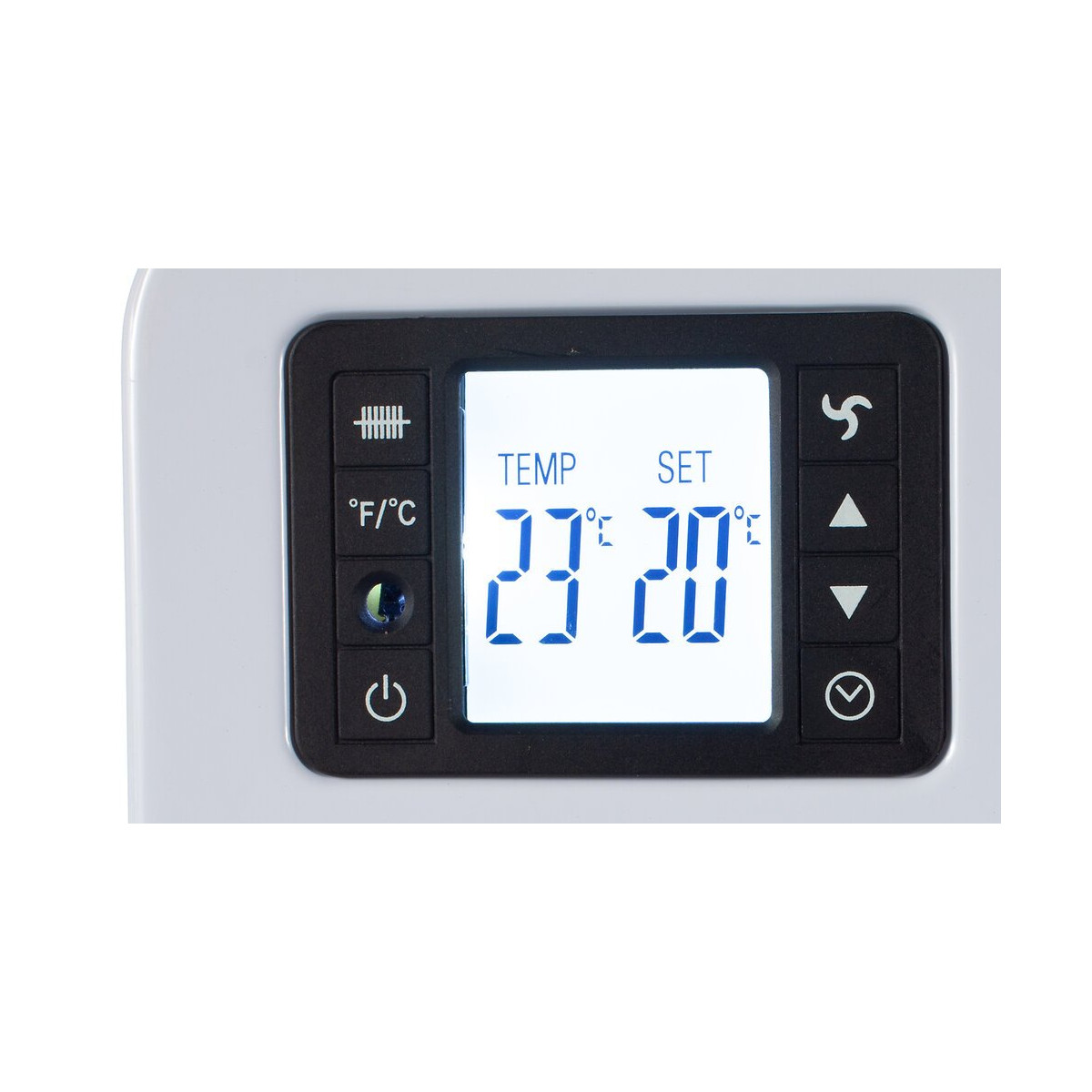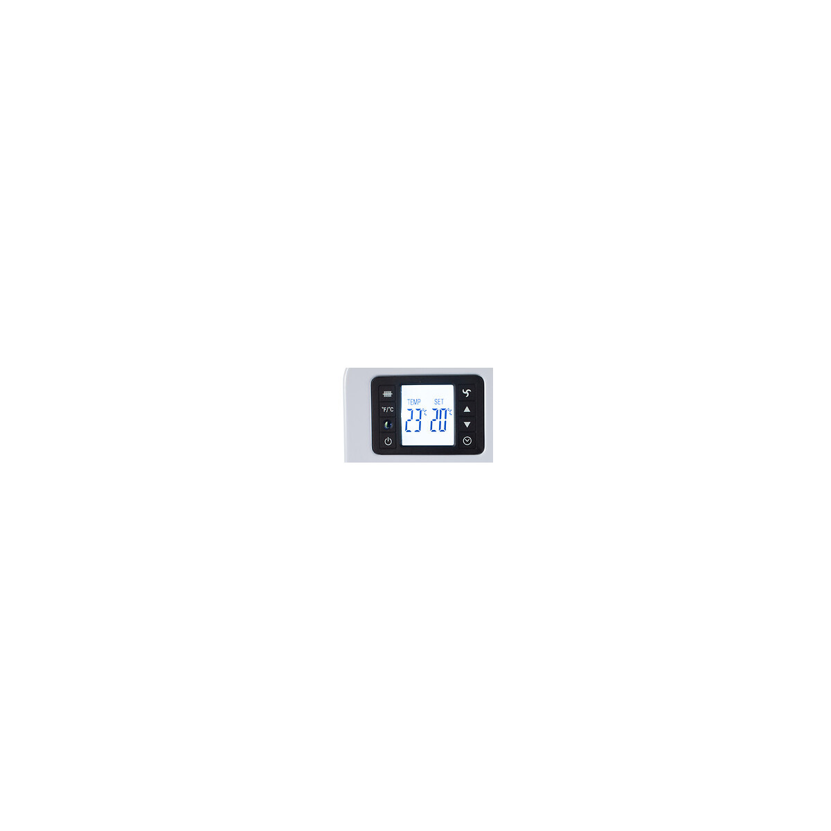 Ce radiateur à convection vous permettra de chauffer rapidement les pièces de vie et les bureaux. Une régulation thermostatique donne la possibilité de régler la température désirée entre 5- 37 °C. L'appareil dispose d'une protection contre les surchauffes intégrée. Tous les paramètres sont à programmer sur l'écran LCD qui montre des informations sur les fonctions sélectionnées et affiche la température de la pièce. La télécommande fournie permet de régler l'appareil à distance, CARACTÉRISTIQUES TECHNIQUES: Ecran tactile LCD, Puissance réglable: 1000/1300/2300 W, Télécommande pour réglage en distance, Plage de températures : 5°- 37°C, Affichage de la température en degré Celsius ou en Fahrenheit , Protection contre la surchauffe, Alimentation : 220 - 240 V~ | 50/60 Hz, Fonction turbo ventilation, Ventilation latérale, Dimensions: 69x44x22 cmSpécifications techniques
