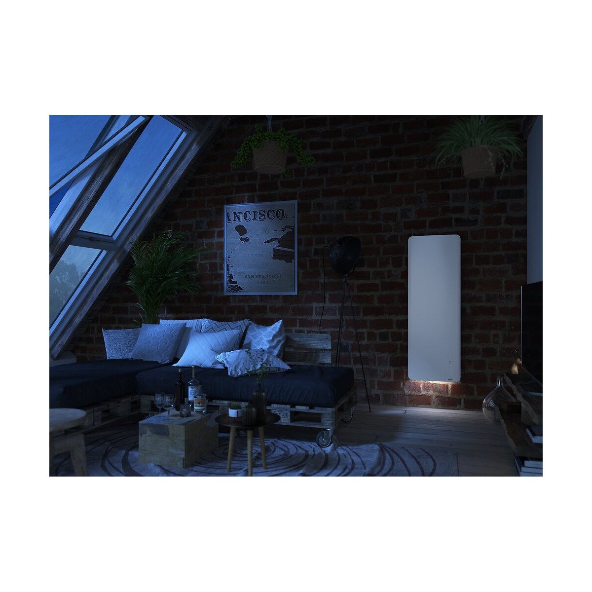 RADIATEUR AUTONOME CHAUFFEZ & CONSOMMEZ JUSTE QUAND IL FAUT: laissez-le faire ou programmez-le selon vos besoins! Apprentissage de votre rythme de vie (absences/présences) pour définir la programmation qui vous correspond Température souhaitée à l'heure souhaitée grâce à l'anticipation de la chauffe Gestion des imprévus: abaissement/hausse de la température en cas d’absence/présence non programmée ECLAIRAGE INTÉGRÉ POUR UNE AMBIANCE CHALEUREUSE TOUTE L'ANNÉE Choisissez la luminosité qui vous convient parmi 4 niveaux d'intensité et la durée en direct ou via votre smartphone Mode nuit en association avec la détection d’absences/présences Eclairage LED basse consommation RADIATEUR CONNECTÉ & COMMUNICANT Pilotage à distance via Smartphone et tablette avec le bridge Cozytouch® (NON INCLUS dans l’emballage) Pilotage de tous les radiateurs d’une même zone/pièce à partir d’un seul radiateur grâce au jumelage des appareils entre eux CHALEUR DOUCE & IMMÉDIATE Chaleur homogène et durable grâce à l’inertie de son corps de chauffe Montée rapide en température grâce à la façade chauffante JUSQU'À 45% D'ÉCONOMIES* Détection automatique d’absences/présences & d’ouverture et fermeture des fenêtres Programmation libre Régulation électronique à 0,1°C près INSTALLATION POSSIBLE DANS TOUS LES COINS Faible largeur: 47 cm Boîtier réversible droite/gauche, rétractable et accessible d’une simple pression (push to open)Spécifications techniques