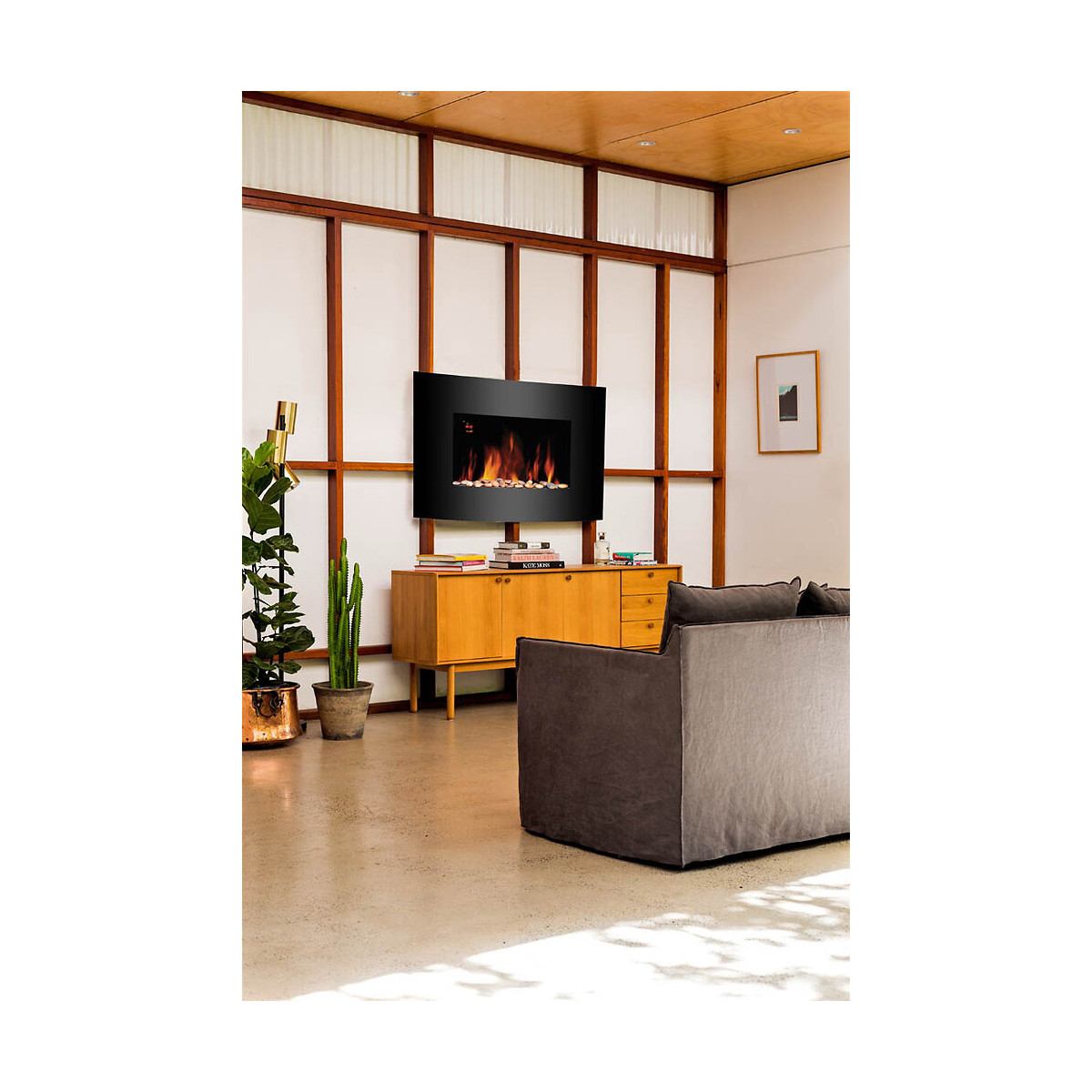 La cheminée murale électrique Calijaw offre un design unique, moderne et épuré, qui en plus de réchauffer un intérieur, représente un objet design. Sa façade galbée en métal noir et verre trempé avec un lit de galets décoratifs sont sublimés par les flammes qui vacillent. Une fois posée sur votre mur grâce aux fixations murales, vous pourrez contrôler la température et les flammes soit grâce au panneau de contrôle soit avec la télécommande incluse. Le rayonnement est maîtrisé ainsi que la consommation et vous aurez la possibilité de choisir indépendamment l'effet flamme de la fonction chauffe. Tous les produits Mazda Energy sont garantis 2 ans. - 2 puissances de chauffe : 900 / 1800 Watts - Façade galbée en métal noir et verre trempé - Télécommande on / off, contrôle thermostat et variateur - Panneau de contrôle manuel sur la cheminée - Effet flammes indépendant de la fonction chauffe - Intensité lumineuse des flammes réglable - Galets décoratifs - Protection anti-surchauffe - Programmation hebdomadaire - Fixation murale - Garantie de 2 ansSpécifications techniques