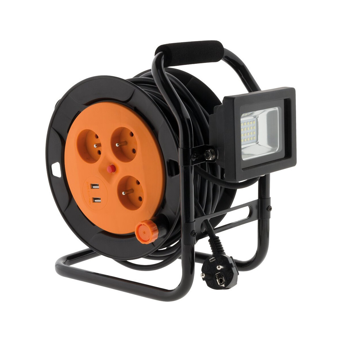 Caractéristiques enrouleur : Longueur 15mètres Câble H05VV-F 3G1, 0mm² Double chargeur USB 2, 1A (cumulés)Guide câble intégré Protection thermique Puissance maxi enroulé 900W 230V~Puissance maxi déroulé 2300W 230V~o Caractéristiques projecteur LED : Puissance : 10W – 800Lumens Rotation du projecteur : 180°Protection IP44
