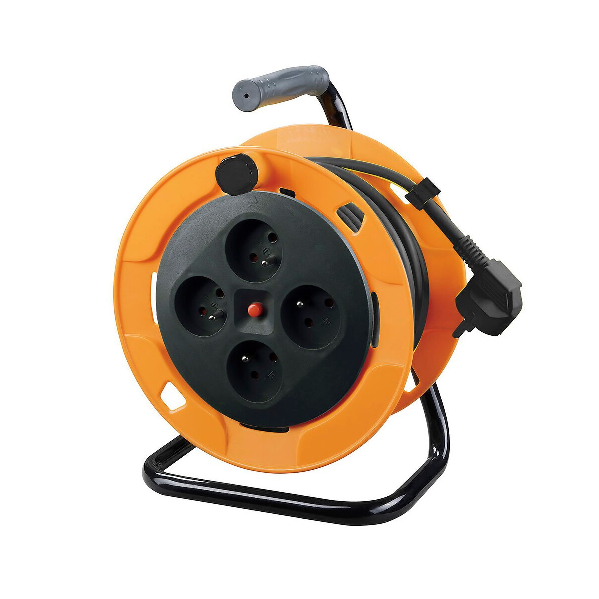 Enrouleur bricolage 15m 3G1,5 avec 4 prises. Avec protection des enfants et coupure thermique Câble : H05VV-F 3G1.5mm², 15m (longueur brute) Panneau noir Bobine dorange (PANTENE 137 C) Bouton rouge Support, poignée et bouton noirs Câble noir NF