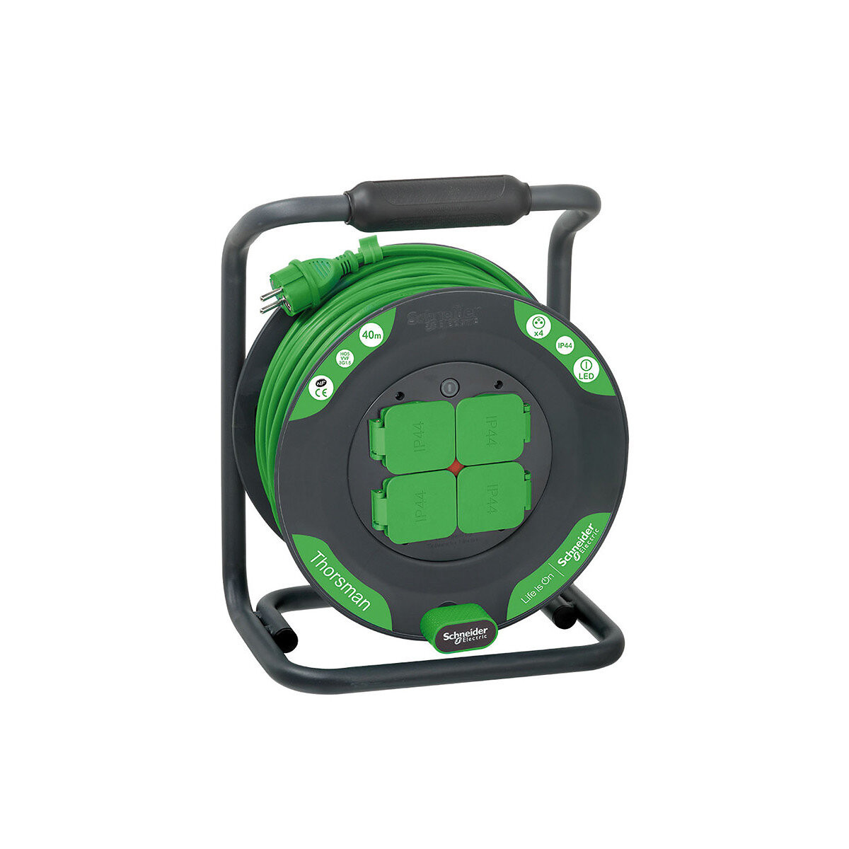 Travaillez plus efficacement et plus confortablement sur vos chantiers d?aménagement intérieur, de rénovation ou d?électricité grâce à la nouvelle gamme d?enrouleurs de câble électrique Schneider Electric. Ces enrouleurs aux lignes originales et ergonomiques sont à la fois compacts et simples à utiliser. Polyvalents, ils vous apportent plus de fonctionnalités. Leur design épuré s'accompagne de fonctions ingénieuses, telles que les témoins LED, ainsi que de poignées ergonomiques permettant un enroulement et un transport en toute facilité. Nos enrouleurs ont été spécialement optimisés pour offrir un maximum de confort, y compris lors de vos projets électriques et de rénovation les plus exigeants. Caractéristiques : Vert, câble 40m, 4 prises 2P+T, IP44, chassis en métal, dimensions (Lxlxh) 29.5x37.5x29.5, type de câble HO5VVF 3G1.5, CE, NF.