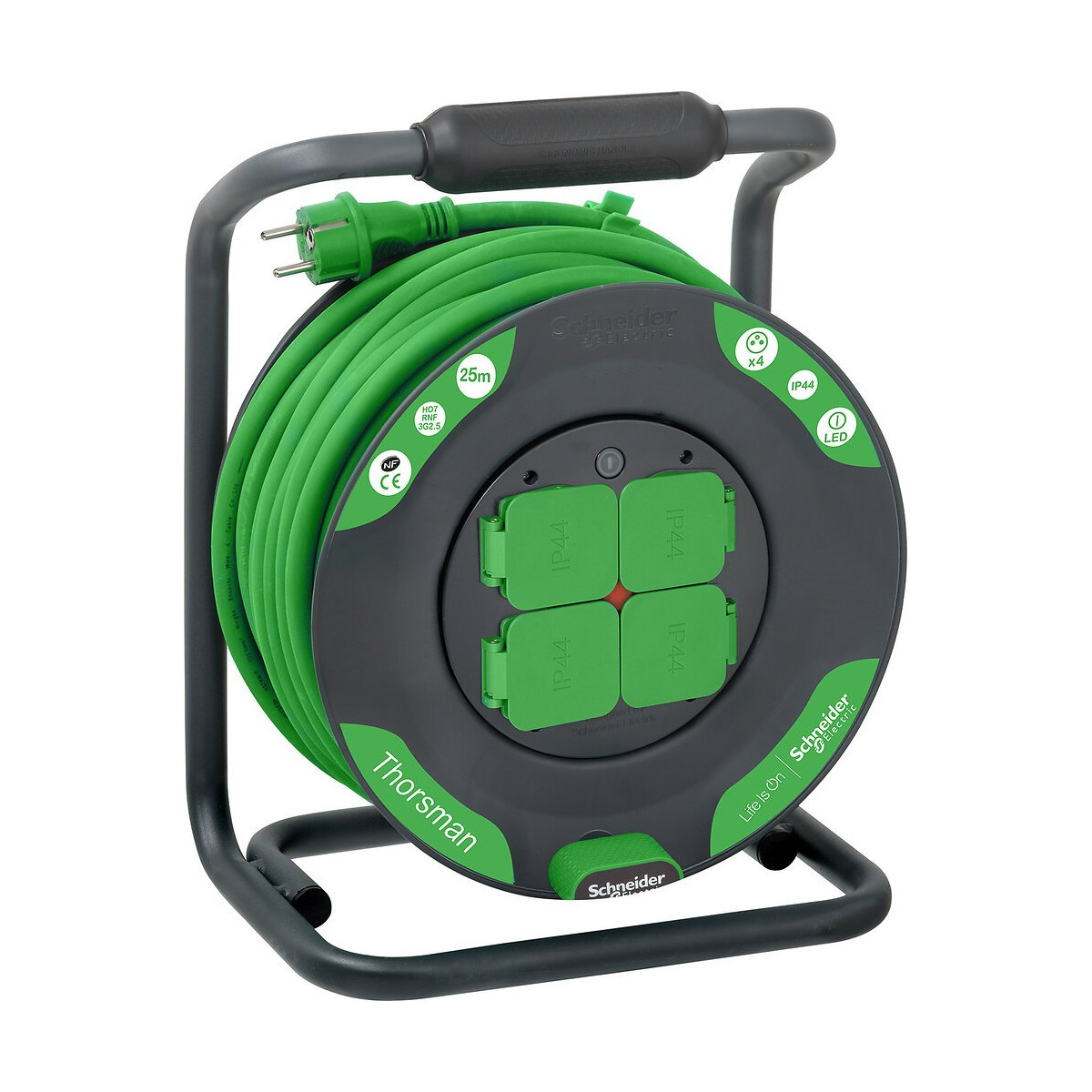 Travaillez plus efficacement et plus confortablement sur vos chantiers d?aménagement intérieur, de rénovation ou d?électricité grâce à la nouvelle gamme d?enrouleurs de câble électrique Schneider Electric. Ces enrouleurs aux lignes originales et ergonomiques sont à la fois compacts et simples à utiliser. Polyvalents, ils vous apportent plus de fonctionnalités. Leur design épuré s'accompagne de fonctions ingénieuses, telles que les témoins LED, ainsi que de poignées ergonomiques permettant un enroulement et un transport en toute facilité. Nos enrouleurs ont été spécialement optimisés pour offrir un maximum de confort, y compris lors de vos projets électriques et de rénovation les plus exigeants. Caractéristiques : Vert, câble 25m, 4 prises 2P+T, IP44, chassis en métal, dimensions (Lxlxh) 29,5x37,5x29,5, type de câble HO7RNF 3G2.5, CE, NF