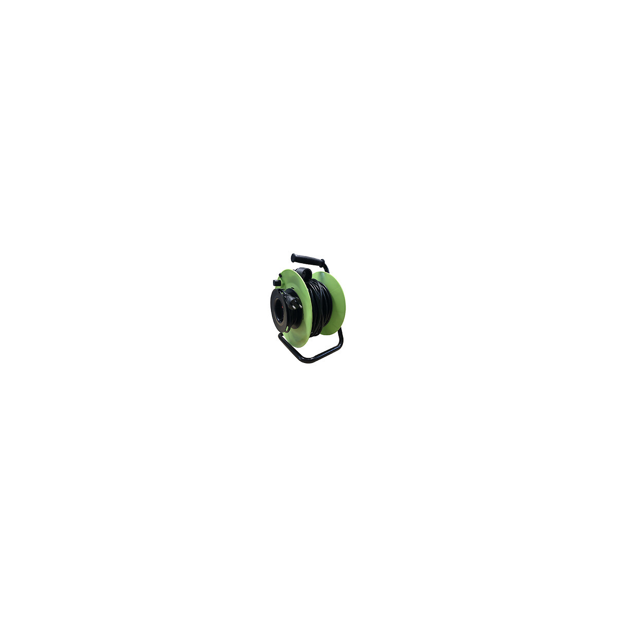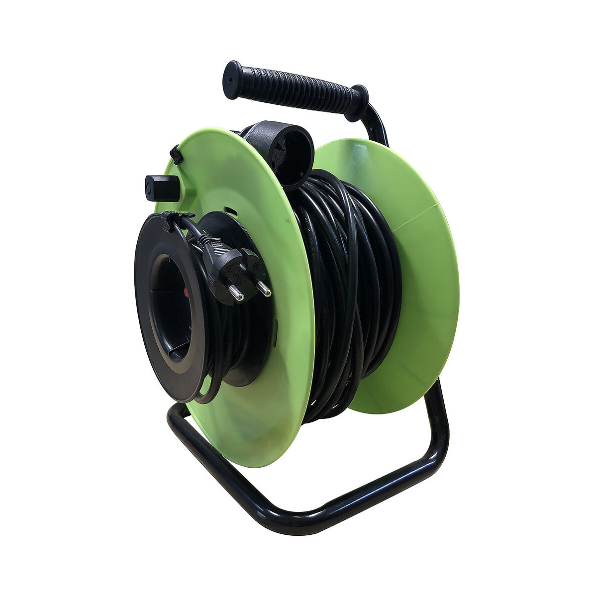 Enrouleur jardin 2X1,5MM 30 M Prise avec protection des enfants, Avec protection contre la surchauffe, Le câble : H05VV-F 2x1.5MM2, 30M(longueur brute). Grande bobine verte (PANTONE 374U), Petite bobine noire, Bouton rouge, Support, poignée et bouton noirs. Câble noir. NF