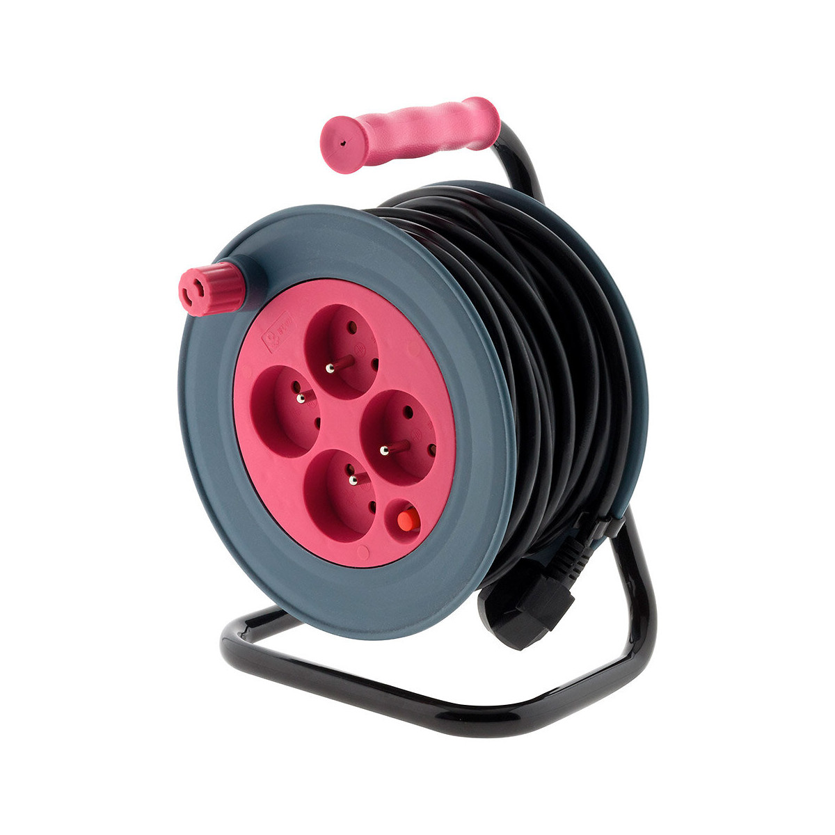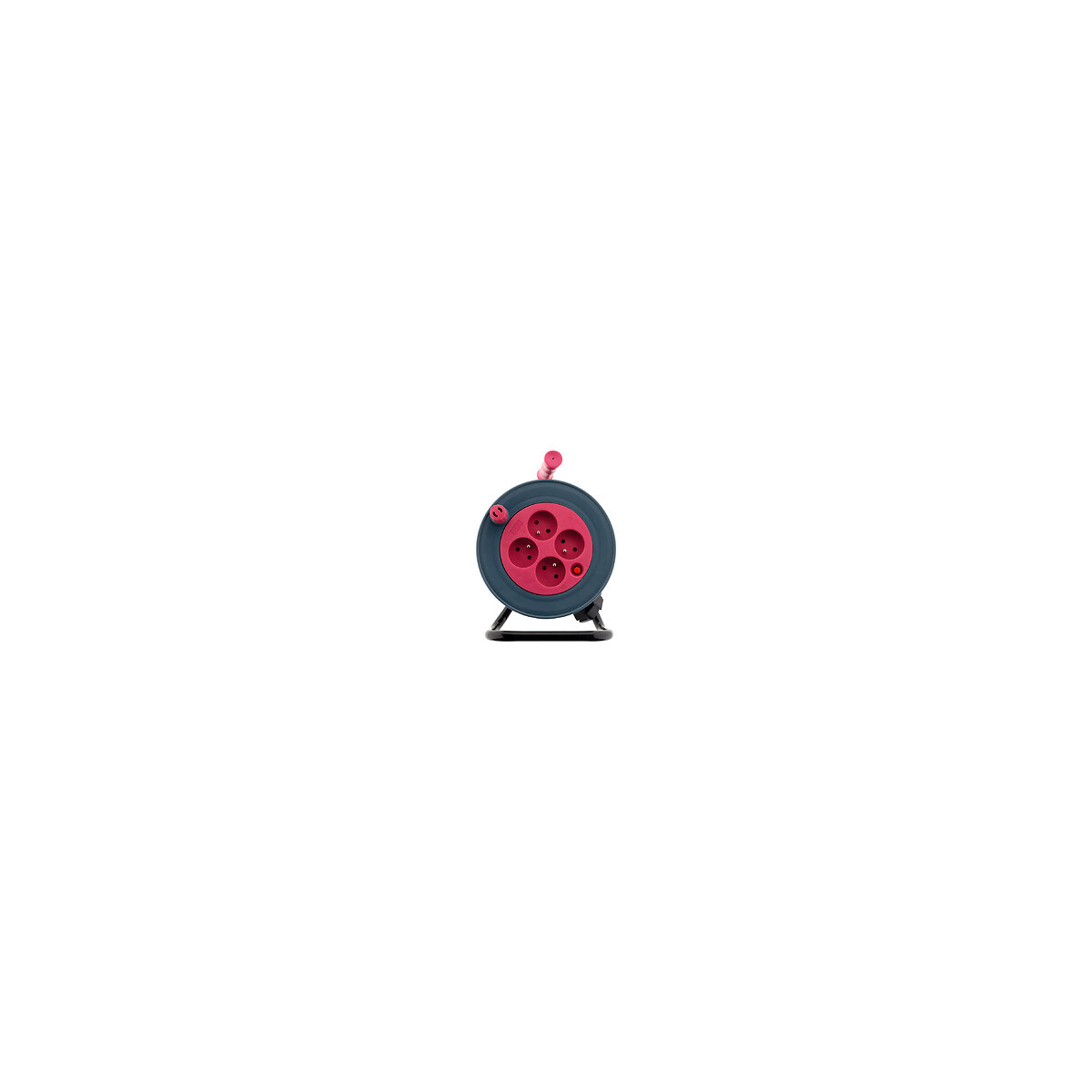 Enrouleur ménager couleur rose 4 prises 2P+T. Puissance maxi sous 230V: 900W (enroulé) - 2300W (déroulé). Câble: H05VV-F 3G1 mm (15m).