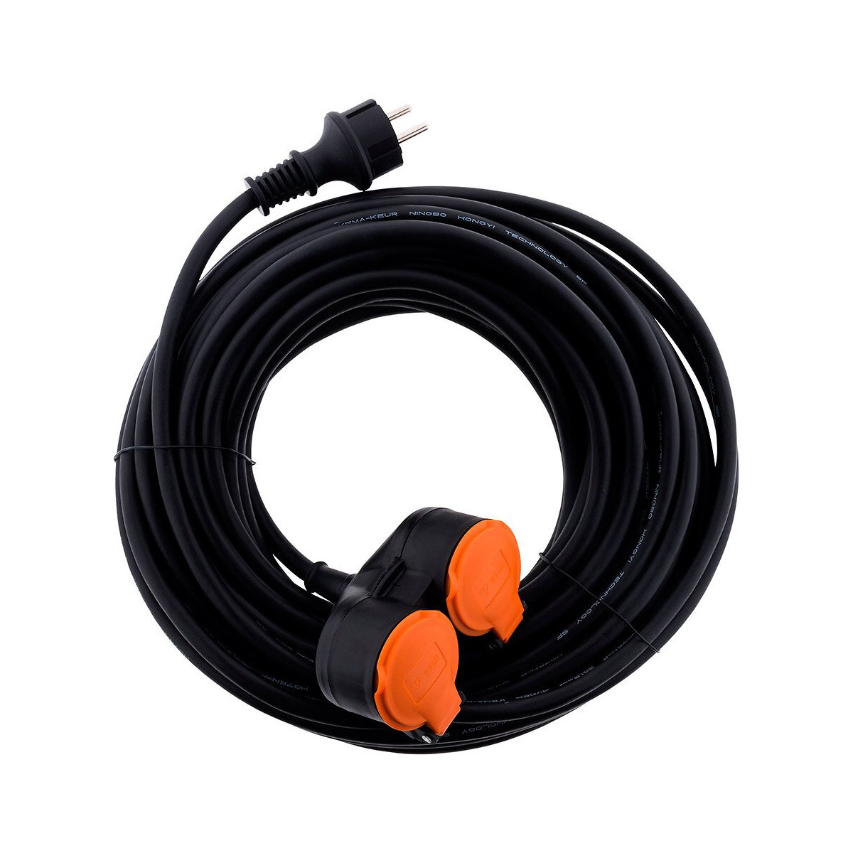 Rallonge 2 prises 2P+T IP44 H07RN-F 3x1,5mm² 10m avec clip de fixation orange. Cette rallonge de 10m 2P+T est prévue pour un usage extérieur avec sa protection IP44. Câble H07RN-F 3G1,5mm² et clip de fixation orange. Idéale pour les appareils électriques reliés à la terre (nettoyeur haute pression, pompe de piscine, éclairage extérieur).