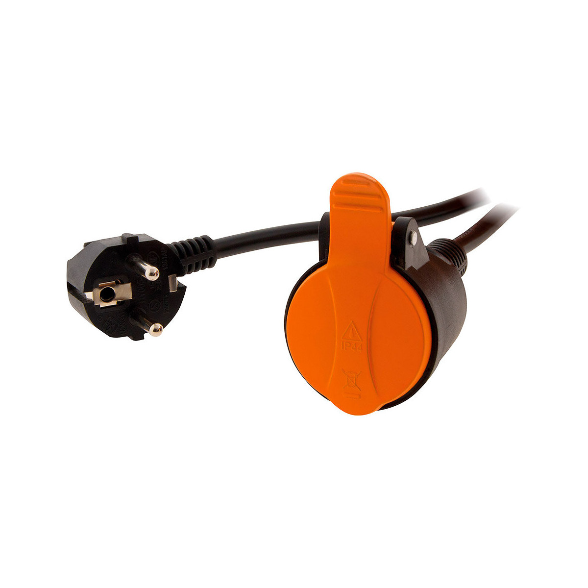 Rallonge 2P+T IP44 H07RN-F 3x1,5mm² 25m avec clip de fixation orange. Cette rallonge de 25m 2P+T est prévue pour un usage extérieur avec sa protection IP44. Câble H07RN-F 3G1,5mm² et clip de fixation orange. Idéale pour l'alimentation d'appareils électriques reliés à la terre, elle permet de brancher nettoyeurs haute pression, pompes de piscine, éclairages extérieurs.