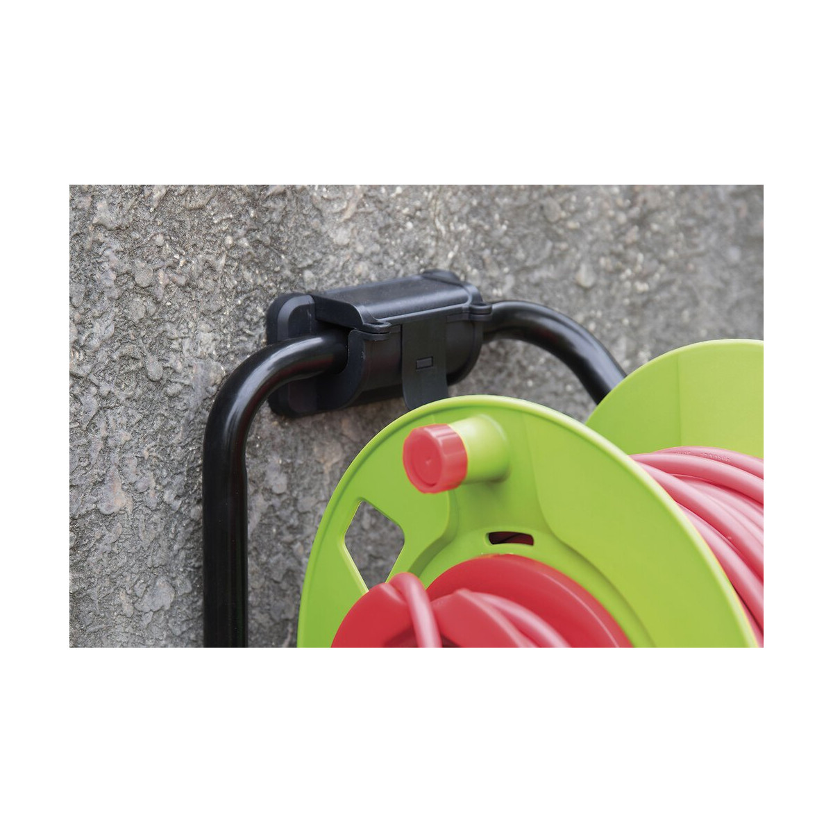 Ce support mural vous permet de stocker en un point d'ancrage fixe votre enrouleur électrique. Très robuste, il se fixe au mur par vis avec un entraxe de 80mm et est doté d'un double système de verrouillage frontal. Il s'installe facilement en trois étapes. Il vous suffit de fixer le support au mur, de placer l'enrouleur dans le support puis de fermer le clapet du support.