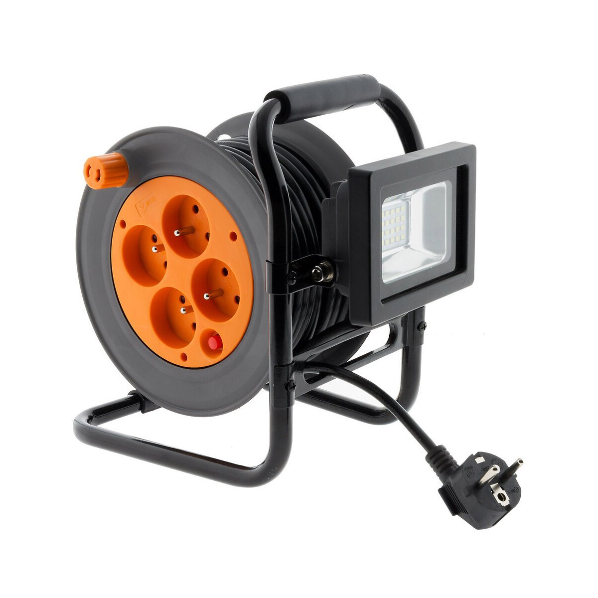Enrouleur domestique électrique 4 prises 16A 2P+T. Idéal pour connecter plusieurs appareils électriques, cet enrouleur électrique intège un projecteur LED 10W pour vous permettre de profiter d?un éclairage précis et orientable tout en utilisant vos appareils électriques. Câble HO5VV-F type 3G1 de 15m avec guide câble, poignet de support et d'enroulage.