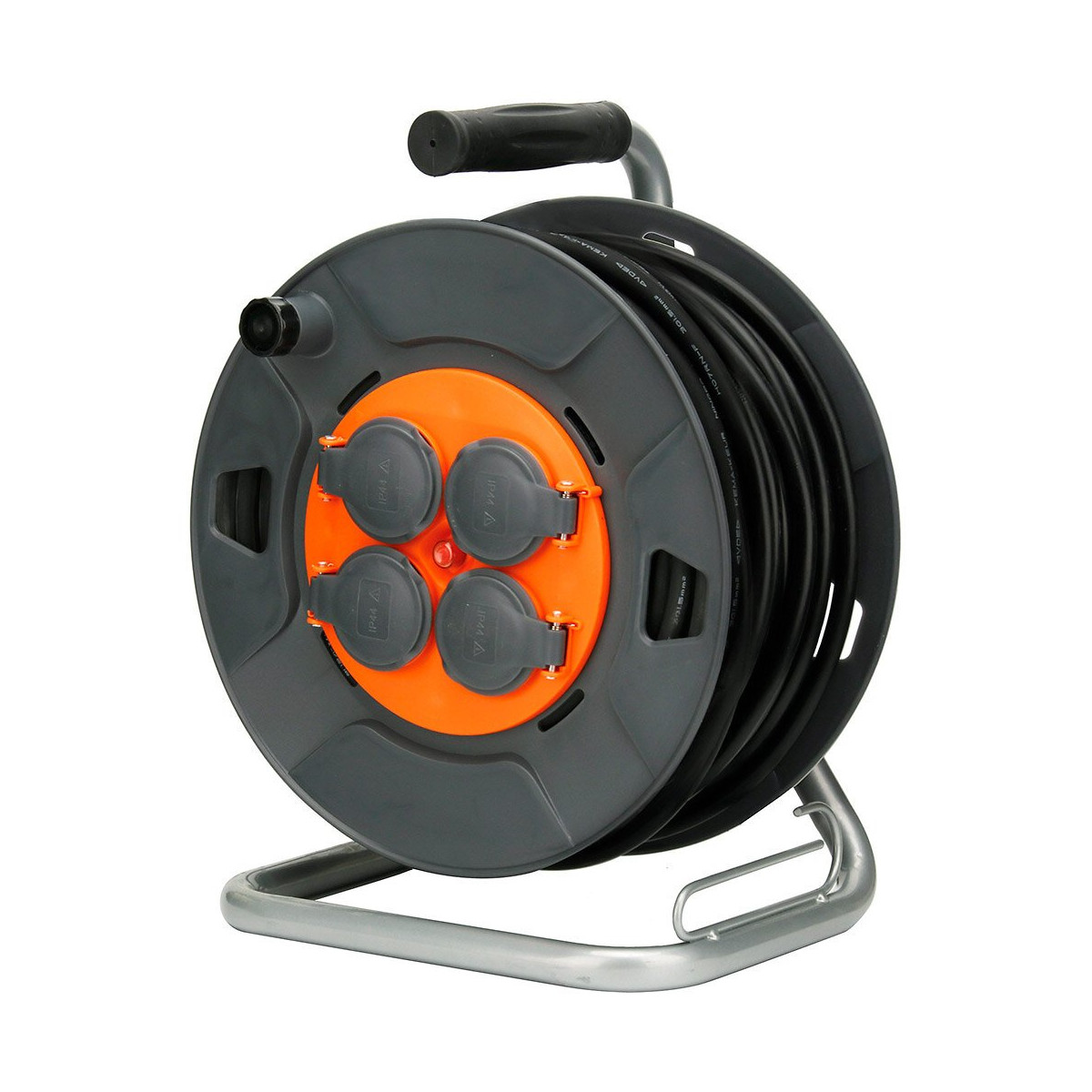Cet enrouleur de chantier est idéal pour tous vos travaux électriques intérieurs ou extérieurs. Equipé d'un guide câble pour faciliter et accélérer l'enroulement, il vous assure une sécurité optimale grâce à sa protection thermique et de surcharge - 1000W (câble enroulé) et 3000W (câble déroulé). Grâce à sa protection étanche IP44 et à ses clapets de protection situés au niveau des 4 prises électriques, il résiste parfaitement aux intempéries. La manivelle extractible dont il est pourvu vous permet d'enrouler plus facilement le câble (HO7RN-F 3G1,5mm², 40 mètres). Traité avec une peinture vinylique anti-corrosion, son cadre est particulièrement robuste et durable dans le temps.