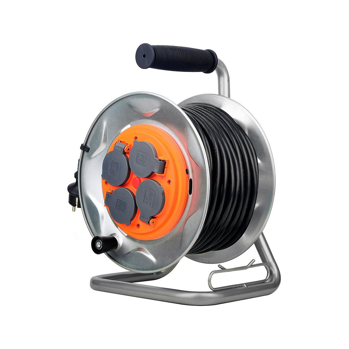 Cet enrouleur de chantier est idéal pour tous vos travaux électriques. Equipé d'un guide câble pour faciliter et accélérer l'enroulement, il vous assure une sécurité optimale grâce à sa protection thermique et de surcharge - 1100W (câble enroulé) et 3000W (câble déroulé). Grâce à sa protection étanche IP44 et à ses clapets de protection situés au niveau des 4 prises électriques, il résiste parfaitement aux intempéries. La platine fixe dont il est pourvu vous permet de rembobiner le câble (HO7RN-F 3G2,5mm², 25 mètres) sans avoir à débrancher les appareils alimentés. Conçu en acier galvanisé et traité avec une peinture vinylique anti-corrosion, son cadre est particulièrement robuste et durable dans le temps.