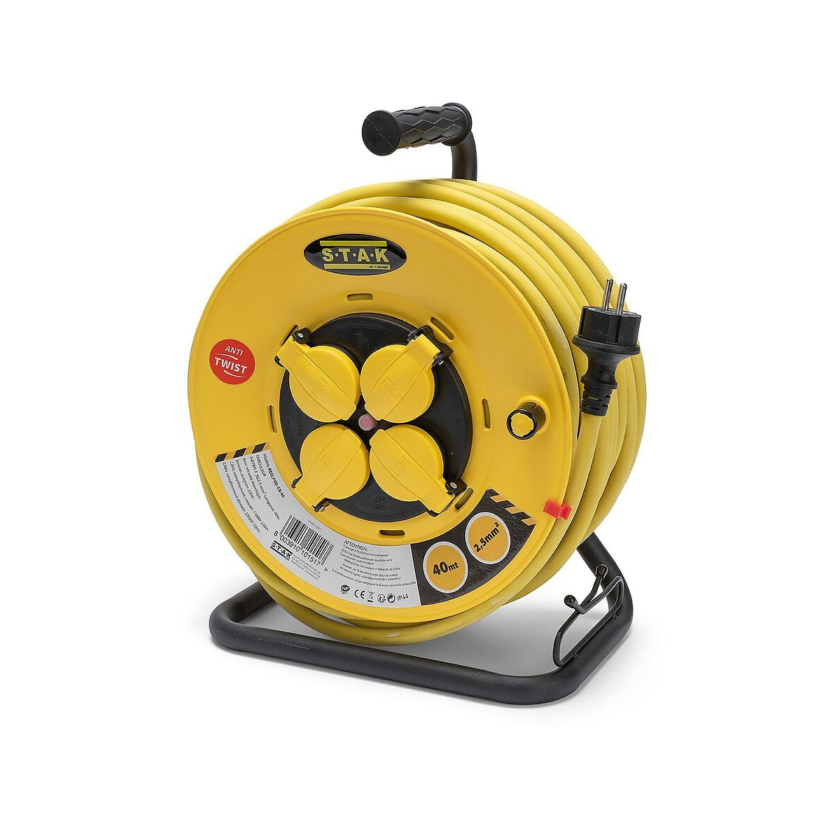 Enrouleur professionnel 4 prises IP44 (2P+T) - Poignée ergonomique et pratique pour gants de travail. Châssis acier hyper résistant. Platine fixe - Vous permet d'enrouler le câble sans avoir à retirer les appareils reliés aux prises. Water proof IP44 - idéal pour le jardin, le bricolage, les chantiers de construction ou les emplois professionnels . Câble 25m H07RN-F en néoprène 3G2.5 m. Avec disjoncteur thermique, bouton de rembobinage rotatif. Puissance max. enroulé: 1100W, déroulé: 3200W. Prises françaises: fiches et prises type E (CEE 7/7).