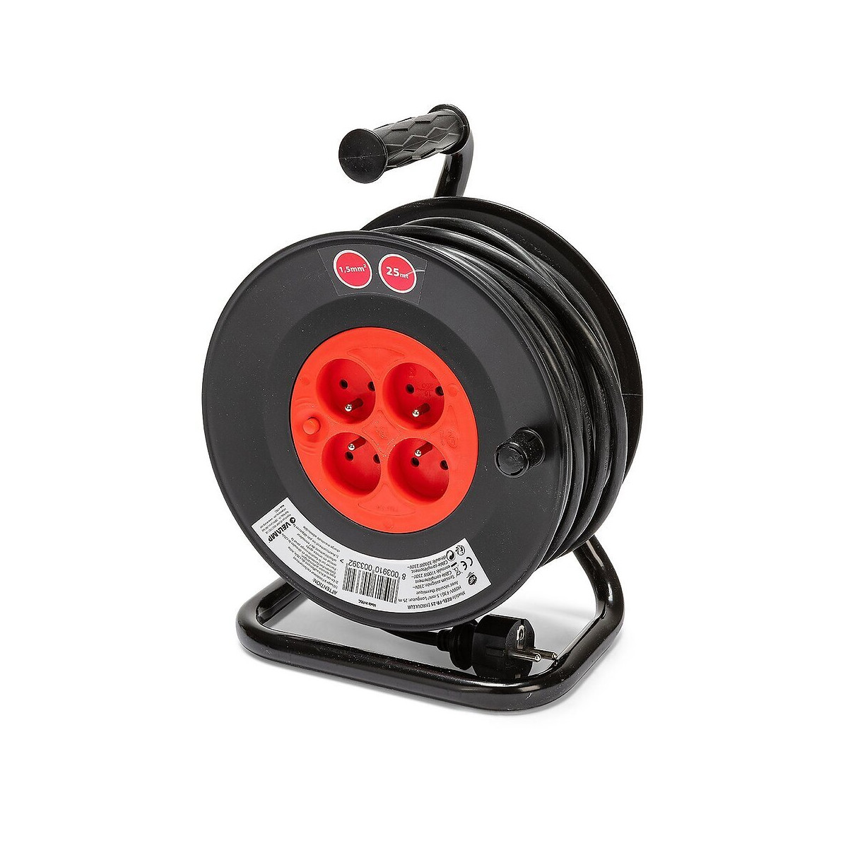 Description: enrouleur électrique avec disjoncteur thermique idéal pour vos travaux ! Enrouleur 25 mètres. 4 prises. 16A - Cable PVC, 3G1, 5mm². Usage intérieur uniquement. Tension assignée: 230V. Normes: CE et NF. Socle métal pour une meilleure stabilité.