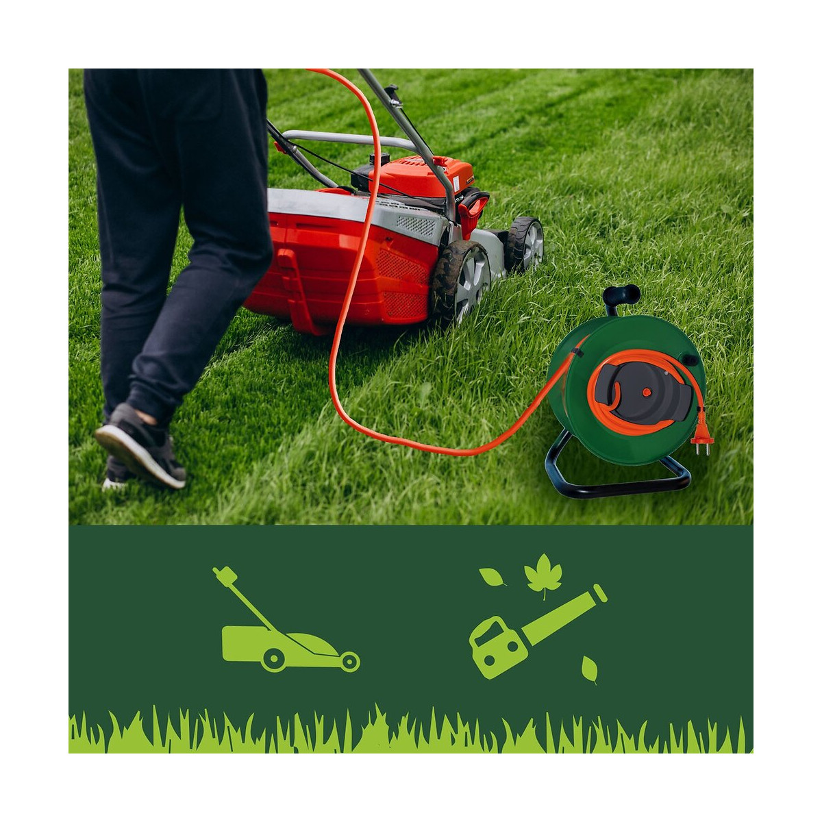 Rallonge avec prise européenne à 2 pôles et prise sans terre pour barbecues, tondeuses à gazon, aspirateurs à feuilles, outils de jardinage électriques. Section de câble HO5 VV-F 2x1.5mmq longueur 40 mètres. Disjoncteur de sécurité - coupe le courant lorsque la puissance dépasse la limite autorisée. Toutes les prises sont équipées de sécurité enfant: elle empêche l'introduction de corps étrangers dans la prise sous tension.Puissance maximale lorsque le câble est enroulé: 1100W Puissance maximale lorsque le câble est déroulé: 3200W.