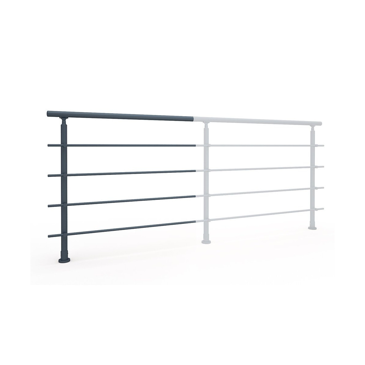 Kit d'extension pour garde-corps aluminium Rondo RAL 7016, prévu en 100cm, ce qui permet d'évoluer par mètre. 100% en aluminium gris anthracite Composé de : 1main courante de diamètre 40mm, longueur 100cm + 1 raccord de jonction + 1 embout de finition1 poteau de diamètre 40mm pour fixation au sol, avec support alu de fixation des lisses sur poteau + 1 pièce de fixation pour sol béton4Lisses de diamètre 16mm, longueur 100cm + 4 raccords de jonction + 4 embouts de finition Vis et chevilles incluses1 tube de colle Usage intérieur et extérieur Facile à installer et à entretenir