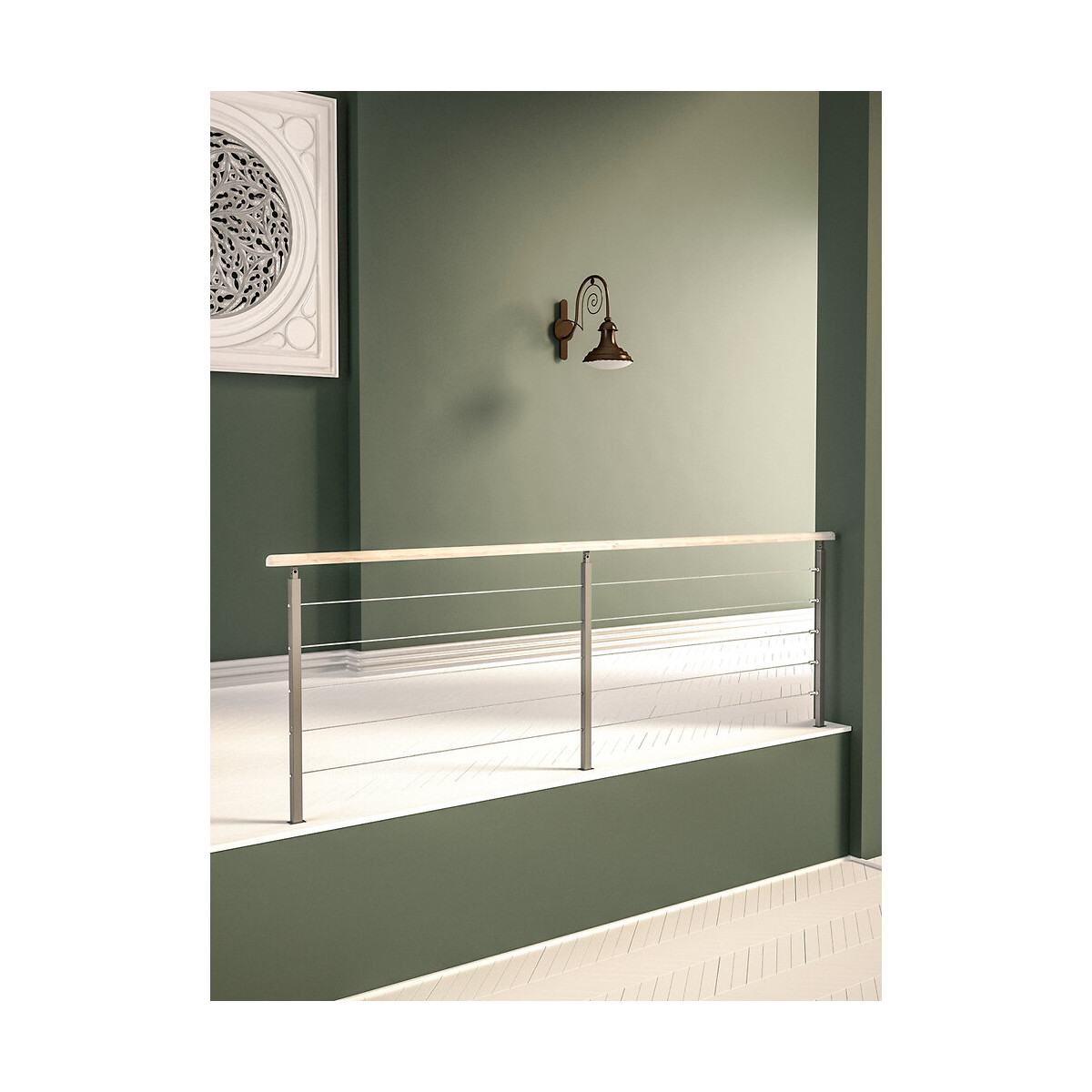 Garde-corps à câbles pour escalier Ardennes Module de 320cm3 poteaux en métal Main courante en chêne Pour adapter toute balustrade à câbles surélevée de 90cm minimum du sol aux normes NF-P01-012 et NBN B 03-004, la plaque de soubassement en verre acrylique est obligatoire Usage intérieur
