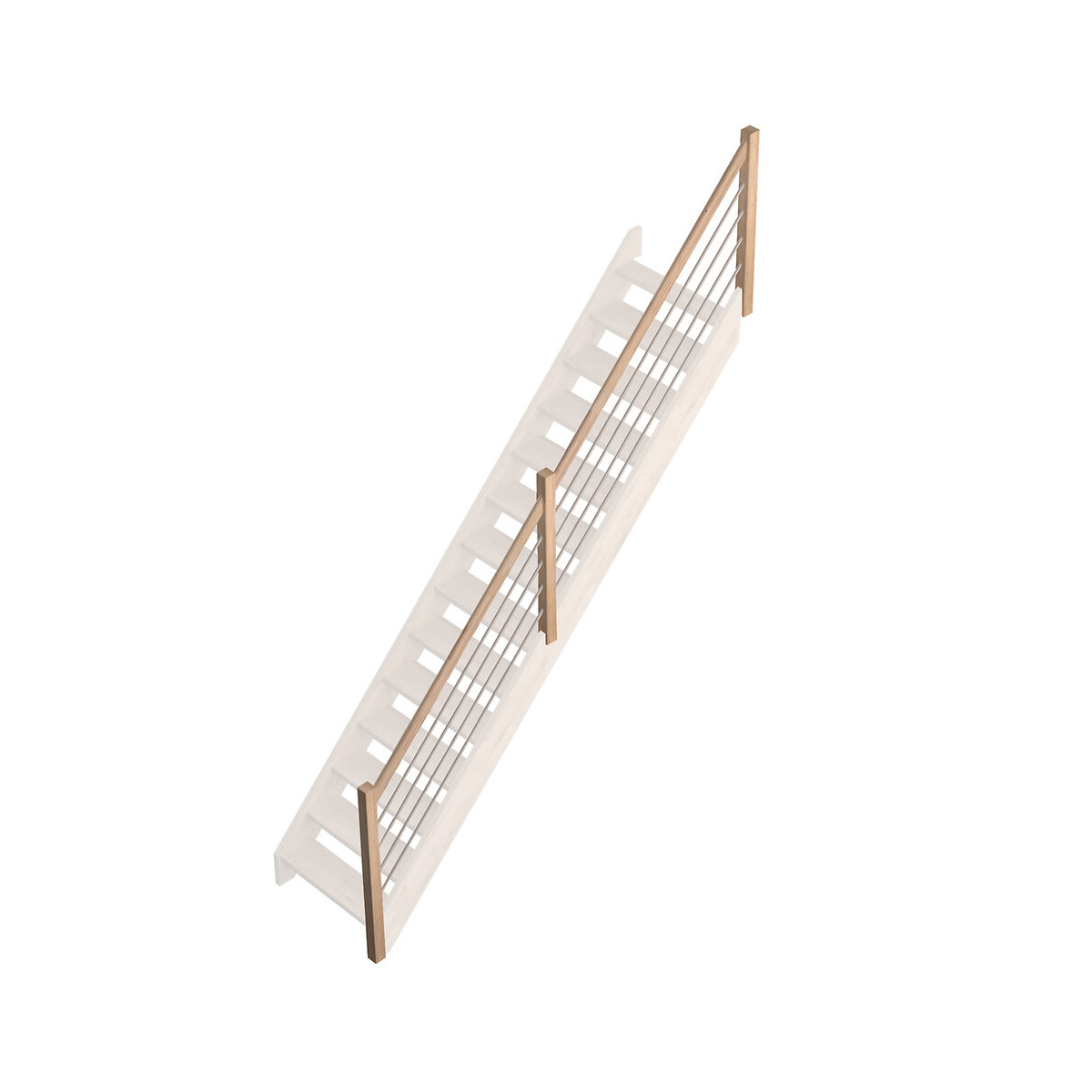 Rampe avec main courante en bois de chêne lamellé B/C pour escalier droit PROVENCE Composé de : 3 poteaux en chêne lamellé B/C et 4Lisses en aluminium Attention : poteau support obligatoire pour l'escalier avec quart tournant haut ! Facile à installer Usage intérieur