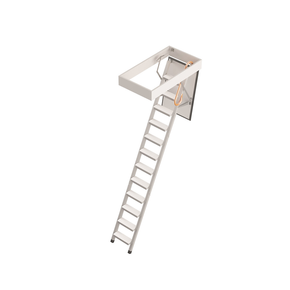Escalier escamotable entièrement monté12 marches en acier (profondeur 11cm) Echelle pliable en 3 parties, à conseiller pour sa robustesse Quincaillerie réglable Rampe métallique Hauteur sol/plafond : 280cmTrappe isolée 36mm avec 2 joints d'étanchéité Caisson MDF Conforme à la norme DIN 4570