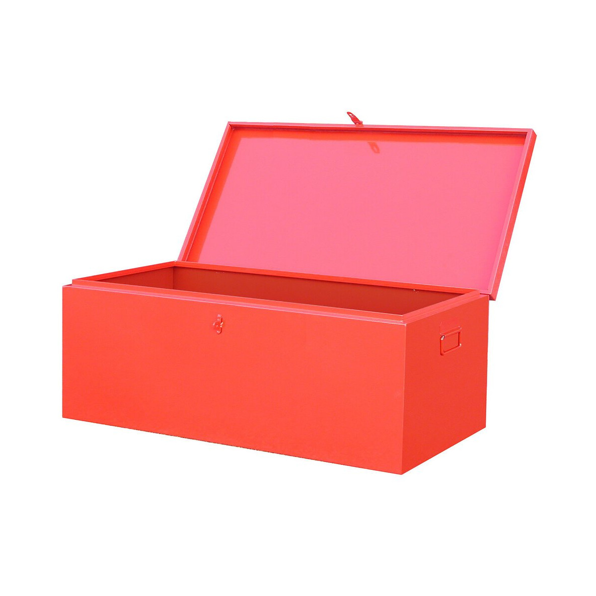 Coffre acier avec charnières renforçées, système de blocage d'ouverture du couvercle. Équipé d'un porte cadenas et de 2 poignées de transport.
