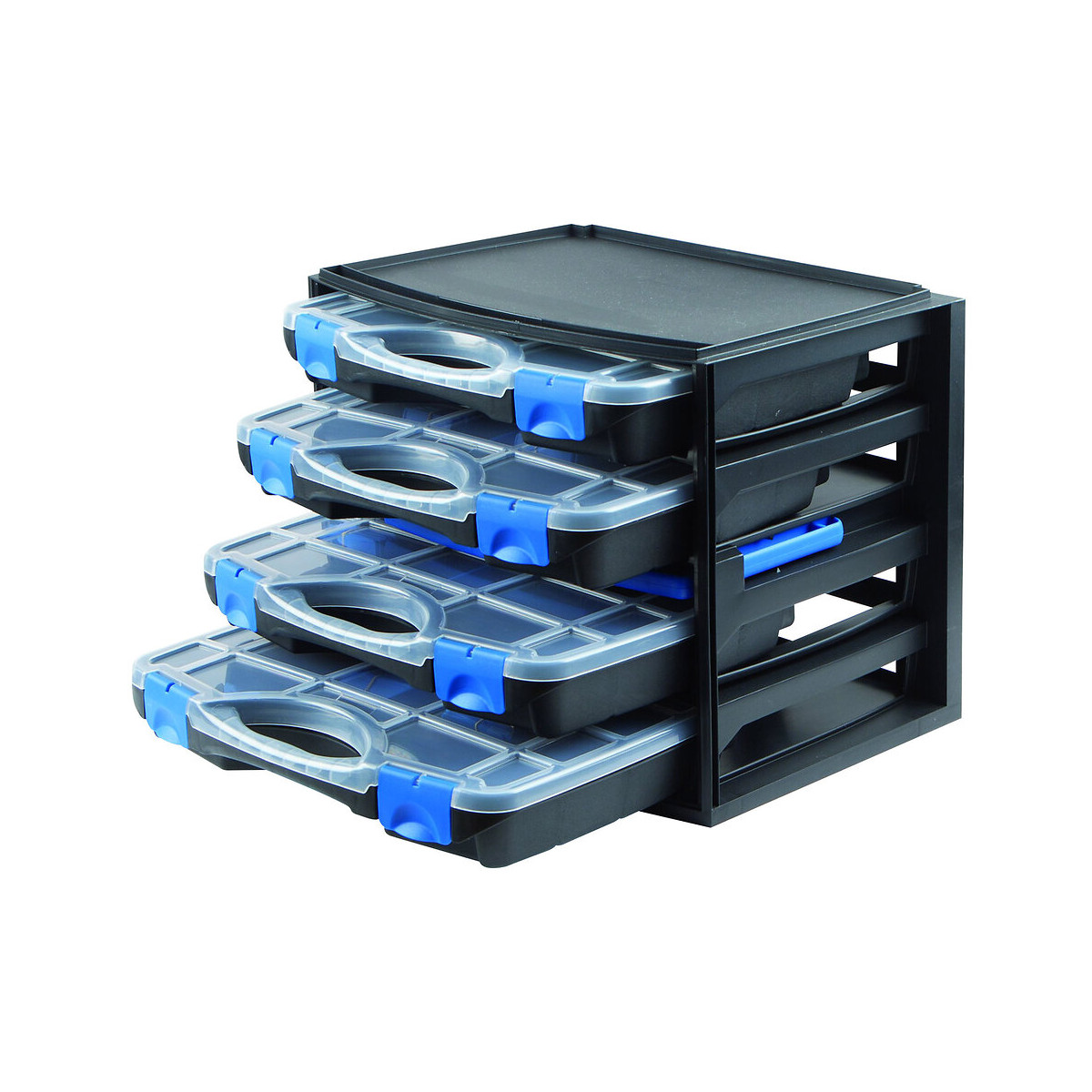 Structure empilable et transportable avec poignée permettant le rangement de 4 mallettes à compartiments modulables de dimensions : 310 x 240 x 45 mm.