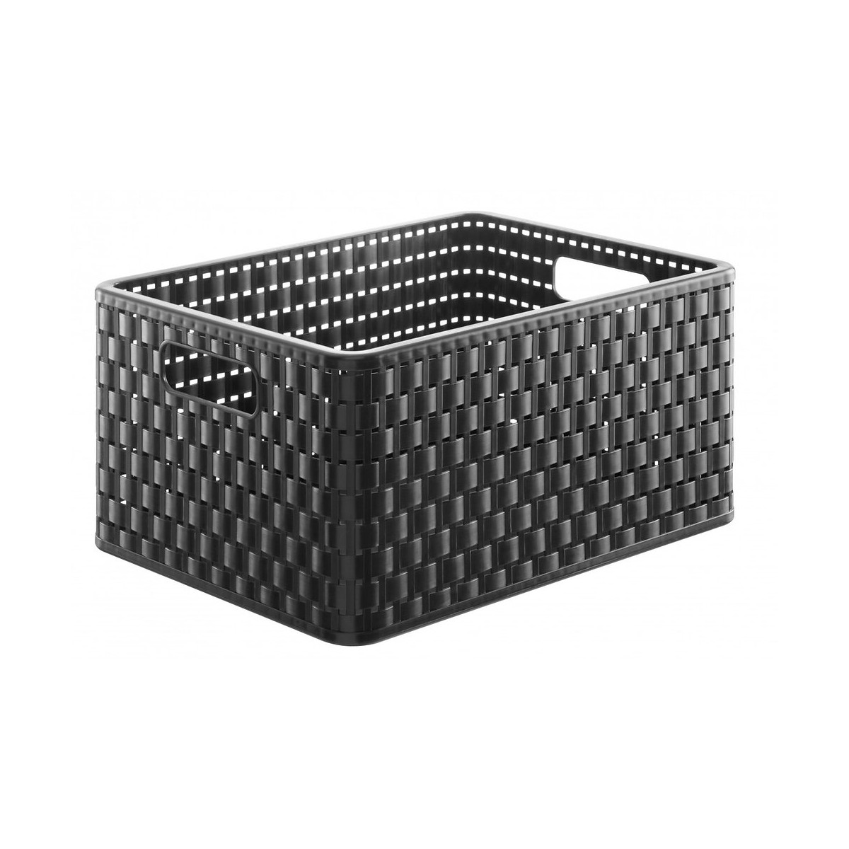 PANIER DE RANGEMENT 18L. Aspect Rotin. 2 Poignées. Superposables et Combinables avec les autres tailles de la gamme. Hauteur (en cm): 19 Largeur (en cm): 27 Profondeur (en cm): 36 Contenance (en l): 18 Matière principale: Plastique Couleur: Noir Usage du produit: Organisation multiusage Avec couvercle: Non Translucide: Non Encastrable: Non Superposable: Oui Roulettes: Non Stockage de denrées alimentaires possible: Non Dimension du produit (en cm): l.27.8 x P.36.8 x H.19.1 cm Fabrication "Union Européenne": Non Fabrication française: Non Produit emballé : hauteur (en cm): 38.5 Produit emballé : largeur (en cm): 27.8 Produit emballé : profondeur (en cm): 36.8 Produit emballé : poids (en kg): 1.68 Indication du geste de tri (triman): Nos produits et emballages peuvent faire l'objet d'une consigne de tri. Pour en savoir plus : www.quefairedemesdechets.fr