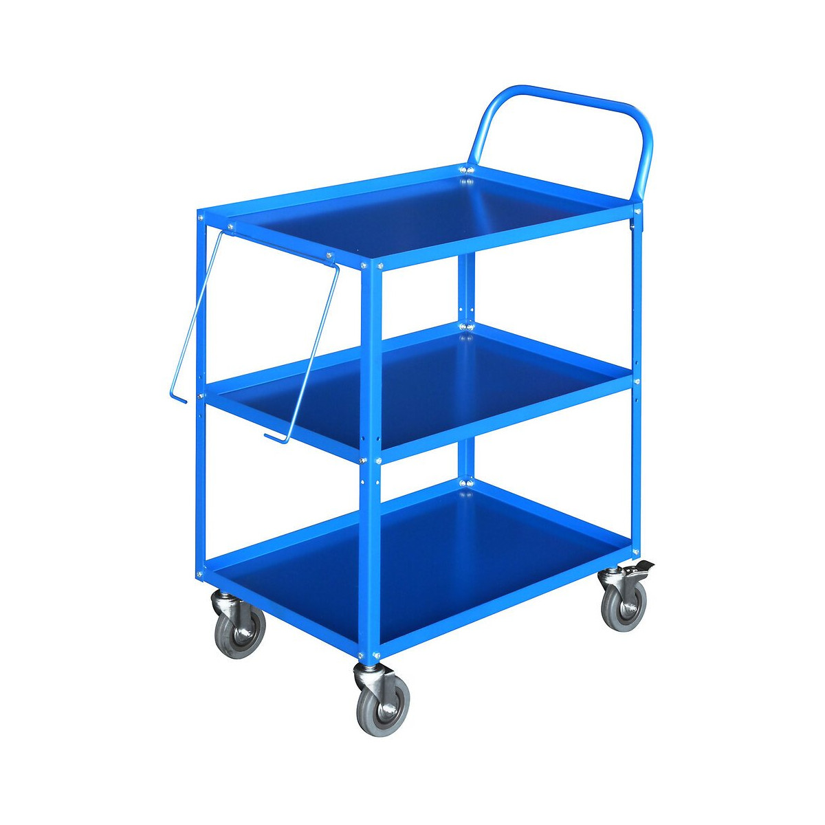 Servante OUTIFRANCE avec trois plateaux en acier, finition peinture époxy. 4 roues pivotantes à bandage caoutchouc Ø 100 mm, dont 2 avec frein. Hauteur du plateau intermédiaire réglable. Support pour rouleau de papier essuie-tout. En option, il est possible d'ajouter un barre support pour 4 bacs à bec 0,8L dimensions 170 x 100 x h. 80 mm (référence Outifrance 8910525).