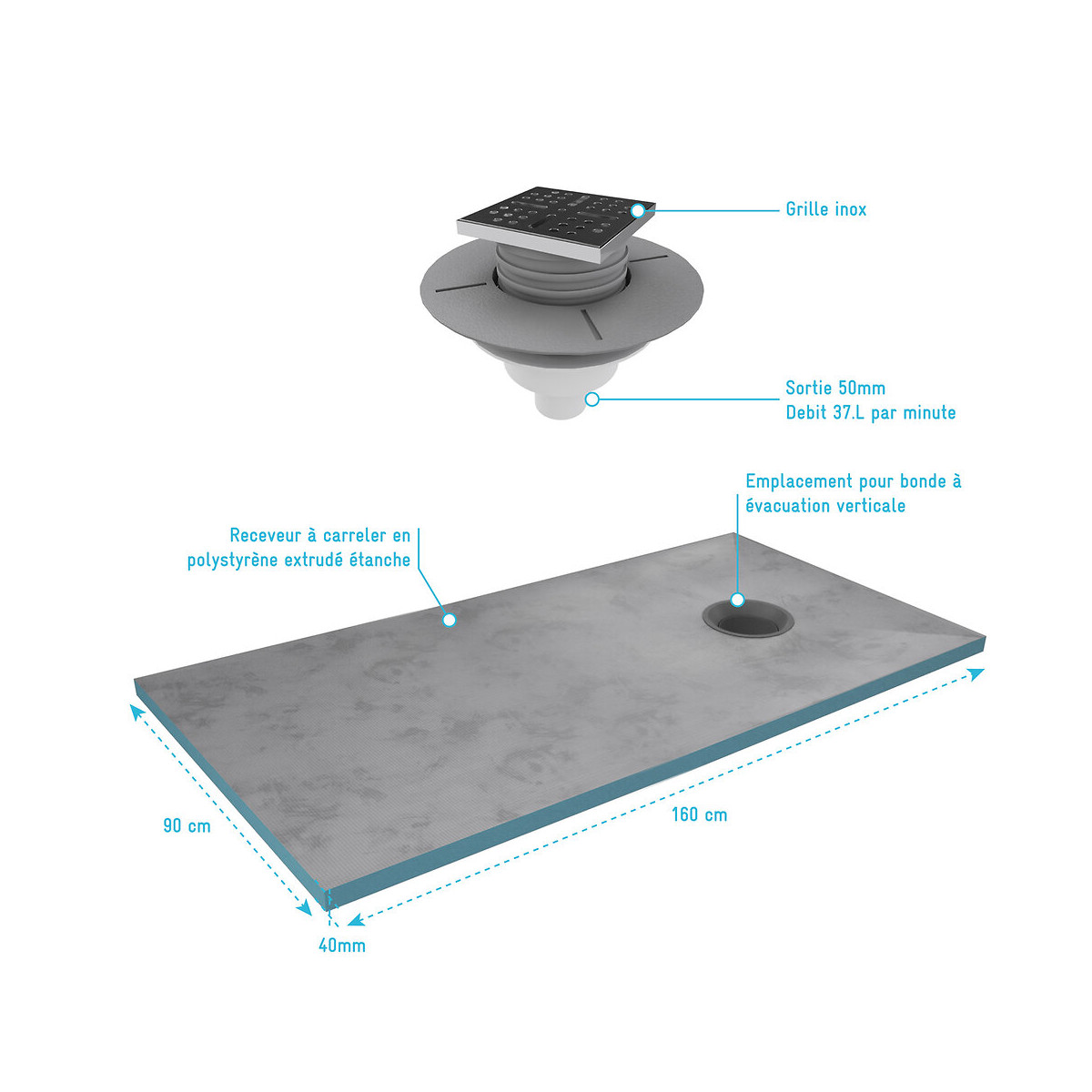 Caractéristiques de la bonde Bonde pour receveur à carreler Sortie verticale en diamètre 50mm Facile à installer grâce à la bague à visser Cheminée découpable à la hauteur du carrelage Bonde compatible uniquement avec les receveur à carreler RAINY et HIGH RAINY Caractéristiques du receveur Receveur à carreler en polystyrène extrudé étanche Facile à installer grâce à la bague à visser Épaisseur 40mm Peut être découpé pour montage sur mesure Dimensions 90x160x4cm Référence: PACR008 Garantie 2 ans pièces et non main d'oeuvre. Profilé noir mat thermolaqué : Le thermolaquage est une technique de traitement spécifique réservé aux matériaux en métal ou en aluminium brut. On projette de la peinture en poudre chargée en électricité statique qui va se déposer sur toute la surface des profilés. Cette technique de pulvérisation en poudre , qui s’appelle projection électrostatique ou poudrage électrostatique, permet d'avoir un revêtement complètement uniforme sur tous les profilés. Ce type de traitement dispense l’utilisation de produits chimiques nocifs pour la santé et l’environnement comme les solvants. Après avoir été recouverte de poudre, la pièce doit passer dans un four où elle sera chauffée pendant 20 minutes à 200°C. Les avantages du thermolaquage : Cette technique possède de nombreux avantage, qui sont La surface peinte possède une dureté supérieure ce qui a pour conséquence une résistance aux chocs accrue Le thermolaquage a une meilleure résistance à la corrosion La couleur des profilés thermolaqués résiste mieux au vieillisement et tout autres élément tel que l'humidité etc. Les profilés thermolaqués présentent une meilleure finition, fini les coulures de peinture et défauts d'aspect, avec cette technique la surface est uniforme Sans solvant c'est un véritable plus pour la santé Mais aussi plus écologique (pas de solvants) Dans un souci de qualité mais aussi de sécurité nos produits répondent à toutes les normes Européennes en vigeur. Que ce soit en terme de sécurité en cas de casse, d'entretien de nos produits ou de la durée de vie de ces derniers, nos produits remplissent tous les critères. Verre trempé : Le verre trempé est un verre qui a subi un traitement afin d’améliorer ses propriétés. Nous utilisons la trempe thermique qui consiste à porter le verre à très haute température (environ à 700 °C), puis de le refroidir rapidement. Ce processus favorise l'apparition de tensions en profondeur et celle de la compression à la surface du verre. Tout cela a pour effet l’amélioration de sa résistance aux chocs. Il est de 2 à 5 fois plus résistant que le verre simple. Mais aussi diminue grandement la dangerosité du verre car en cas de casse le verre explose en de petits morceaux et non pas en de grands pans tranchants. Pour le reste il conserve les mêmes propriétés que le verre classique Norme harmonisée : EN14428:2004 Certification Européenne: Aptitude au nettoyage : EN14428 :2004+A1:2008 Clause 4.2 Résistance à l’impact / Propriétés d’éclatement: EN14428:2004+A1:2008 Clause 4.3 Durabilité : EN14428:2004+A1:2008 Clause 4.4 MyShowerRoom c’est aussi la garantie de durabilité : Nous garantissons un stocks de pièces détachées d’au moins 5 ans Notre visserie est en acier inoxydable ce qui est une garantie anticorrosion Garantie 2 ans pièces uniquement Cocorico ! MyShowerRoom est une entreprise Française et toute la conception de nos produits est également Française. Ce qui est un véritable plus pour être au plus près de ses clients et avoir une meilleure connaissance de leurs attentes. Qui sommes nous L’HISTOIRE DE MYSHOWERROOM Nous avons créé MyShowerRoom en 2003 avec l’ambition de démocratiser le design et l’innovation dans la salle de bain pour faire de cette pièce un lieu à part entière, un véritable lieu d’histoires à vivre pour toute la famille. Nos cabines de douche et meubles de salle de bain dans l’ère du temps à des tarifs très accessibles. Nos nombreux brevets garantissent l’originalité de notre gamme de cabines de douches. Et nos ingénieurs mettent en œuvre tout leur savoir-faire et toutes les technologies innovantes au service d’une simplicité d’installation et d’utilisation incomparable pour tous. ÊTRE BIENVEILLANT AVEC NOS CLIENTS Notre service client a un objectif : rendre nos clients heureux. Pour cela nous veillons à répondre dans les 24h aux demandes clients. Mais aussi de toujours apporter une solution et entière satisfaction à nos clients. CONSTRUIRE DES PRODUITS TOUJOURS PLUS PERFORMANTS Nos ingénieurs, ainsi que nos équipes terrain consacrent tous leurs efforts à créer des produits adaptés à vos besoins, et toujours plus innovants grâce à nos technologies. Notre objectif est d’être votre unique interlocuteur pour tous vos projets de salle de bain. CONCRÉTISER LES RÊVES DE CHACUN Un projet de salle de bain ? Nous le réalisons ! Lieu de détente et de relaxation par excellence, la salle de bain est une des pièces maîtresse de la maison. Chez MyShowerRoom, nous mettons tout en oeuvre afin que ce rêve devienne réalité. PROPOSER UNE GAMME COMPLÈTE DE PRODUITS Nous vous proposons grâce à notre boutique en ligne une gamme complète de produits Made in MyShowerRoom pour équiper, et accessoiriser votre salle de bain. Un catalogue que nous renouvelons régulièrement avec les dernières technologies MyShowerRoom. APPORTER UNE EXPERTISE HUMAINE Parce que l’humain passe avant tout, nous travaillons avec les meilleurs experts. La satisfaction de nos clients est notre seule et unique priorité. Chaque problème a une solution, et c’est dans cette optique que nous avons mis en place un chat pour échanger directement avec nos équipes. NOTRE CENTRE LOGISTIQUE 11 000 m² d’entrepôt 7000 palettes en stock 1 800 colis traités par jour Plus de 260 préparations de commandes quotidiennes