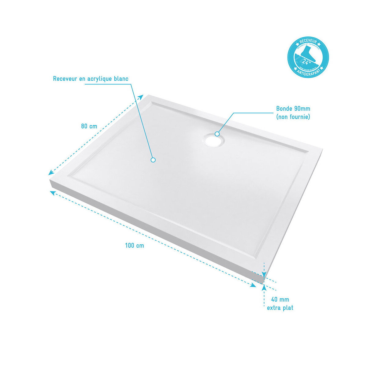 Caractéristique du receveur : Receveur en acrylique blanc Faible épaisseur : 4 cm À poser ou à encastrer dans le sol bonde 90 mm non fournie Dimensions du receveur : 100x80x4cm Garantie 2 ans pièces uniquement Cocorico ! MyShowerRoom est une entreprise Française et toute la conception de nos produits est également Française. Ce qui est un véritable plus pour être au plus près de ses clients et avoir une meilleure connaissance de leurs attentes. Qui sommes nous L’HISTOIRE DE MYSHOWERROOM Nous avons créé MyShowerRoom en 2003 avec l’ambition de démocratiser le design et l’innovation dans la salle de bain pour faire de cette pièce un lieu à part entière, un véritable lieu d’histoires à vivre pour toute la famille. Nos cabines de douche et meubles de salle de bain dans l’ère du temps à des tarifs très accessibles. Nos nombreux brevets garantissent l’originalité de notre gamme de cabines de douches. Et nos ingénieurs mettent en œuvre tout leur savoir-faire et toutes les technologies innovantes au service d’une simplicité d’installation et d’utilisation incomparable pour tous. ÊTRE BIENVEILLANT AVEC NOS CLIENTS Notre service client a un objectif : rendre nos clients heureux. Pour cela nous veillons à répondre dans les 24h aux demandes clients. Mais aussi de toujours apporter une solution et entière satisfaction à nos clients. CONSTRUIRE DES PRODUITS TOUJOURS PLUS PERFORMANTS Nos ingénieurs, ainsi que nos équipes terrain consacrent tous leurs efforts à créer des produits adaptés à vos besoins, et toujours plus innovants grâce à nos technologies. Notre objectif est d’être votre unique interlocuteur pour tous vos projets de salle de bain. CONCRÉTISER LES RÊVES DE CHACUN Un projet de salle de bain ? Nous le réalisons ! Lieu de détente et de relaxation par excellence, la salle de bain est une des pièces maîtresse de la maison. Chez MyShowerRoom, nous mettons tout en oeuvre afin que ce rêve devienne réalité. PROPOSER UNE GAMME COMPLÈTE DE PRODUITS Nous vous proposons grâce à notre boutique en ligne une gamme complète de produits Made in MyShowerRoom pour équiper, et accessoiriser votre salle de bain. Un catalogue que nous renouvelons régulièrement avec les dernières technologies MyShowerRoom. APPORTER UNE EXPERTISE HUMAINE Parce que l’humain passe avant tout, nous travaillons avec les meilleurs experts. La satisfaction de nos clients est notre seule et unique priorité. Chaque problème a une solution, et c’est dans cette optique que nous avons mis en place un chat pour échanger directement avec nos équipes. NOTRE CENTRE LOGISTIQUE 11 000 m² d’entrepôt 7000 palettes en stock 1 800 colis traités par jour Plus de 260 préparations de commandes quotidiennes 12 quais de chargement/déchargement CONSEILS & VENTES Une équipe disponible 5 jours sur 7 pour vous accompagner dans vos achats. LIVRAISON GRATUITE Pour toute commande sur le site MyShowerRoom, la livraison est gratuite dans toute la France. UNE GARANTIE DE QUALITÉ Grâce à nos produits brevetés vous bénéficiez de produits uniques. Référence produit: FAC375 Retrouvez plus d'informations produit et des conseils de montage sur le site Aurlane. Remarques importantes: Ces colis sont volumineux, la livraison est effectuée par transporteur spécialisé en bas de chez vous. Les chauffeurs ne sont pas habilités à porter la marchandise, mais uniquement à la décharger. Pas de livraison à l'étage. L'adresse de livraison doit être accessible en camion poids lourd. Dans le cas contraire la marchandise sera mise à disposition au dépôt le plus proche (distance non garantie). Les rendez-vous sont gérés directement par les transporteurs. Attention à bien contrôler la marchandise à réception pour éviter tous litiges.
