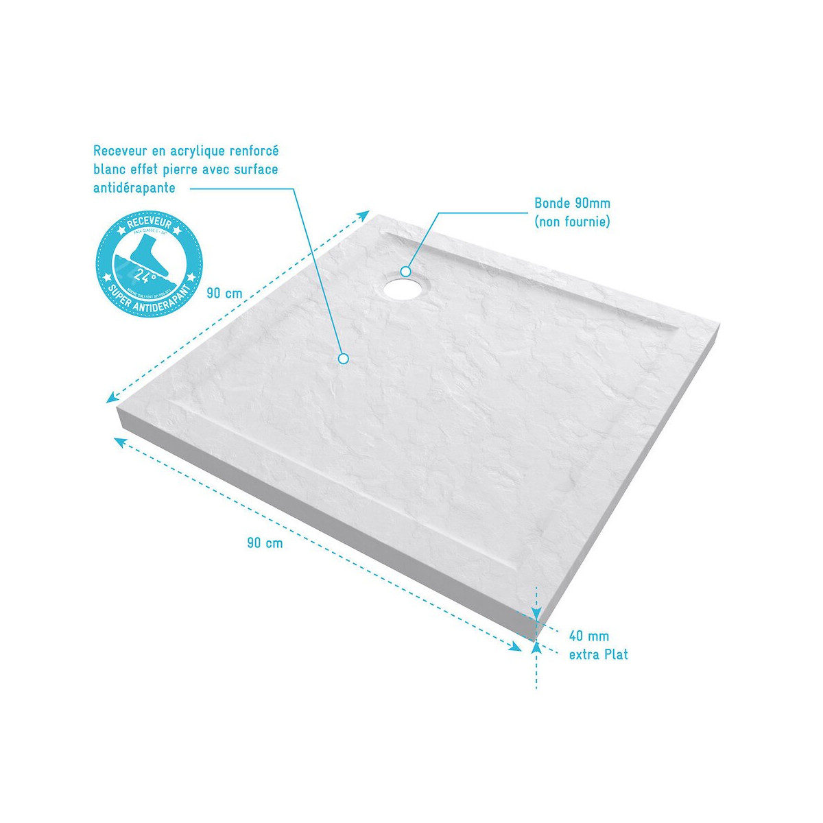 Caractéristiques du receveur : Receveur en acrylique renforcée blanc effet pierre À poser ou à encastrer dans le sol Surface anti-dérapante Faible épaisseur : 4 cm Bonde 90mm non fournie Dimensions 90x90x4cm Les plus produit: Receveur en acrylique renforcée ultra résistant et imputrescible Superbe finition effet pierre Installation facile Référence: FAC363 Garantie 2 ans pièces et non main d'oeuvre. Cocorico ! MyShowerRoom est une entreprise Française et toute la conception de nos produits est également Française. Ce qui est un véritable plus pour être au plus près de ses clients et avoir une meilleure connaissance de leurs attentes. Qui sommes nous L’HISTOIRE DE MYSHOWERROOM Nous avons créé MyShowerRoom en 2003 avec l’ambition de démocratiser le design et l’innovation dans la salle de bain pour faire de cette pièce un lieu à part entière, un véritable lieu d’histoires à vivre pour toute la famille. Nos cabines de douche et meubles de salle de bain dans l’ère du temps à des tarifs très accessibles. Nos nombreux brevets garantissent l’originalité de notre gamme de cabines de douches. Et nos ingénieurs mettent en œuvre tout leur savoir-faire et toutes les technologies innovantes au service d’une simplicité d’installation et d’utilisation incomparable pour tous. ÊTRE BIENVEILLANT AVEC NOS CLIENTS Notre service client a un objectif : rendre nos clients heureux. Pour cela nous veillons à répondre dans les 24h aux demandes clients. Mais aussi de toujours apporter une solution et entière satisfaction à nos clients. CONSTRUIRE DES PRODUITS TOUJOURS PLUS PERFORMANTS Nos ingénieurs, ainsi que nos équipes terrain consacrent tous leurs efforts à créer des produits adaptés à vos besoins, et toujours plus innovants grâce à nos technologies. Notre objectif est d’être votre unique interlocuteur pour tous vos projets de salle de bain. CONCRÉTISER LES RÊVES DE CHACUN Un projet de salle de bain ? Nous le réalisons ! Lieu de détente et de relaxation par excellence, la salle de bain est une des pièces maîtresse de la maison. Chez MyShowerRoom, nous mettons tout en oeuvre afin que ce rêve devienne réalité. PROPOSER UNE GAMME COMPLÈTE DE PRODUITS Nous vous proposons grâce à notre boutique en ligne une gamme complète de produits Made in MyShowerRoom pour équiper, et accessoiriser votre salle de bain. Un catalogue que nous renouvelons régulièrement avec les dernières technologies MyShowerRoom. APPORTER UNE EXPERTISE HUMAINE Parce que l’humain passe avant tout, nous travaillons avec les meilleurs experts. La satisfaction de nos clients est notre seule et unique priorité. Chaque problème a une solution, et c’est dans cette optique que nous avons mis en place un chat pour échanger directement avec nos équipes. NOTRE CENTRE LOGISTIQUE 11 000 m² d’entrepôt 7000 palettes en stock 1 800 colis traités par jour Plus de 260 préparations de commandes quotidiennes 12 quais de chargement/déchargement CONSEILS & VENTES Une équipe disponible 5 jours sur 7 pour vous accompagner dans vos achats. LIVRAISON GRATUITE Pour toute commande sur le site MyShowerRoom, la livraison est gratuite dans toute la France. UNE GARANTIE DE QUALITÉ Grâce à nos produits brevetés vous bénéficiez de produits uniques. Référence produit: FAC363 Retrouvez plus d'informations produit et des conseils de montage sur le site Aurlane. Remarques importantes: Ces colis sont volumineux, la livraison est effectuée par transporteur spécialisé en bas de chez vous. Les chauffeurs ne sont pas habilités à porter la marchandise, mais uniquement à la décharger. Pas de livraison à l'étage. L'adresse de livraison doit être accessible en camion poids lourd. Dans le cas contraire la marchandise sera mise à disposition au dépôt le plus proche (distance non garantie). Les rendez-vous sont gérés directement par les transporteurs. Attention à bien contrôler la marchandise à réception pour éviter tous litiges.