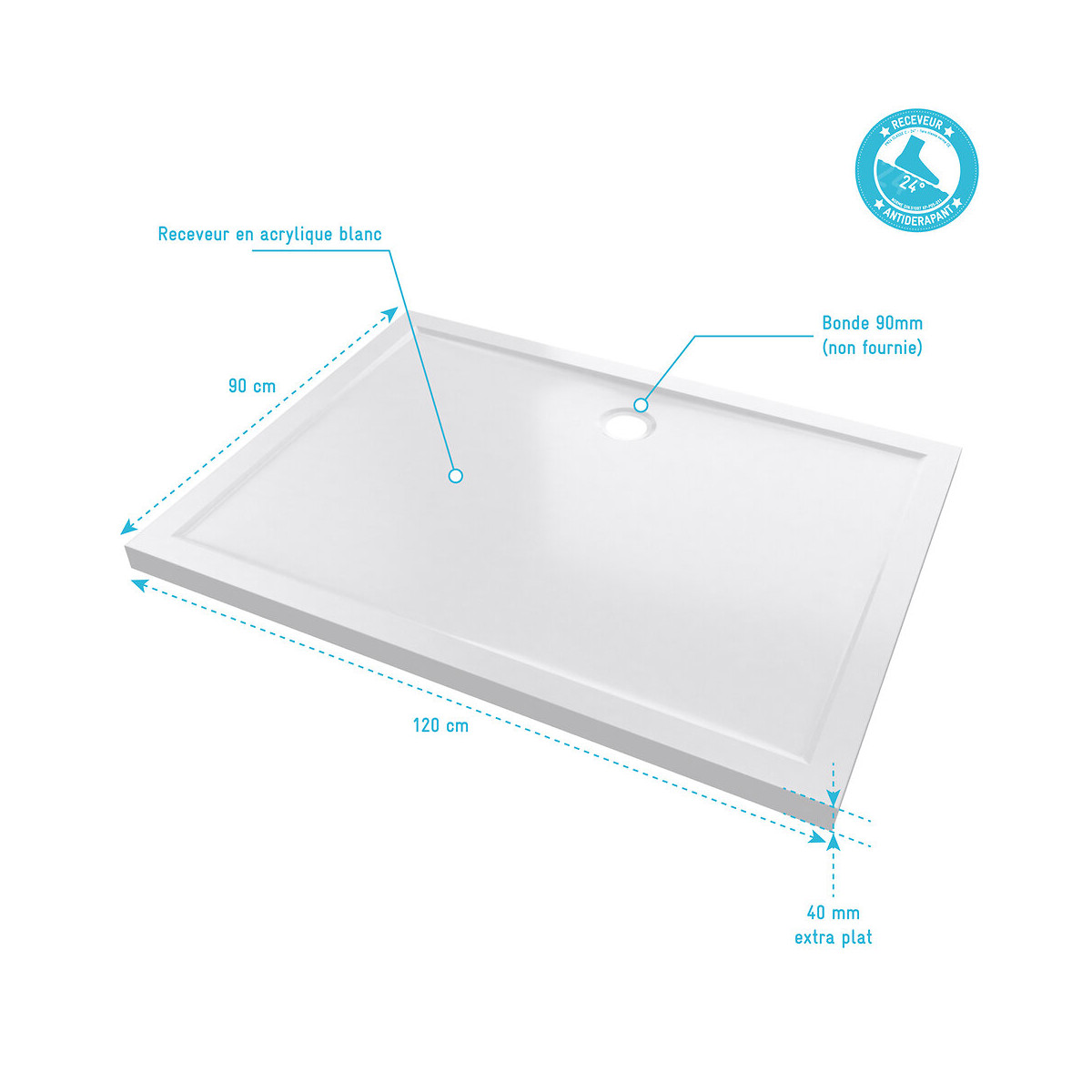 Caractéristiques techniques du receveur Receveur en acrylique blanc A poser ou à encastrer dans le sol Épaisseur extra-plat: 4 cm Surface antidérapante Bonde 90mm non fournie Dimensions du receveur : 120x90x4cm Les plus produit: Extra plat: faible épaisseur de 4cm pour une une salle de bain design et dans l'air du temps Surface anti-dérapante pour plus de sécurité A poser ou à encastrer dans le sol Référence: FAC379 Designation de produit: WHITENESS Garantie 2 ans pièces et non main d'oeuvre. Profilé noir mat thermolaqué : Le thermolaquage est une technique de traitement spécifique réservé aux matériaux en métal ou en aluminium brut. On projette de la peinture en poudre chargée en électricité statique qui va se déposer sur toute la surface des profilés. Cette technique de pulvérisation en poudre , qui s’appelle projection électrostatique ou poudrage électrostatique, permet d'avoir un revêtement complètement uniforme sur tous les profilés. Ce type de traitement dispense l’utilisation de produits chimiques nocifs pour la santé et l’environnement comme les solvants. Après avoir été recouverte de poudre, la pièce doit passer dans un four où elle sera chauffée pendant 20 minutes à 200°C. Les avantages du thermolaquage : Cette technique possède de nombreux avantage, qui sont La surface peinte possède une dureté supérieure ce qui a pour conséquence une résistance aux chocs accrue Le thermolaquage a une meilleure résistance à la corrosion La couleur des profilés thermolaqués résiste mieux au vieillisement et tout autres élément tel que l'humidité etc. Les profilés thermolaqués présentent une meilleure finition, fini les coulures de peinture et défauts d'aspect, avec cette technique la surface est uniforme Sans solvant c'est un véritable plus pour la santé Mais aussi plus écologique (pas de solvants) Dans un souci de qualité mais aussi de sécurité nos produits répondent à toutes les normes Européennes en vigeur. Que ce soit en terme de sécurité en cas de casse, d'entretien de nos produits ou de la durée de vie de ces derniers, nos produits remplissent tous les critères. Verre trempé : Le verre trempé est un verre qui a subi un traitement afin d’améliorer ses propriétés. Nous utilisons la trempe thermique qui consiste à porter le verre à très haute température (environ à 700 °C), puis de le refroidir rapidement. Ce processus favorise l'apparition de tensions en profondeur et celle de la compression à la surface du verre. Tout cela a pour effet l’amélioration de sa résistance aux chocs. Il est de 2 à 5 fois plus résistant que le verre simple. Mais aussi diminue grandement la dangerosité du verre car en cas de casse le verre explose en de petits morceaux et non pas en de grands pans tranchants. Pour le reste il conserve les mêmes propriétés que le verre classique Norme harmonisée : EN14428:2004 Certification Européenne: Aptitude au nettoyage : EN14428 :2004+A1:2008 Clause 4.2 Résistance à l’impact / Propriétés d’éclatement: EN14428:2004+A1:2008 Clause 4.3 Durabilité : EN14428:2004+A1:2008 Clause 4.4 MyShowerRoom c’est aussi la garantie de durabilité : Nous garantissons un stocks de pièces détachées d’au moins 5 ans Notre visserie est en acier inoxydable ce qui est une garantie anticorrosion Garantie 2 ans pièces uniquement Cocorico ! MyShowerRoom est une entreprise Française et toute la conception de nos produits est également Française. Ce qui est un véritable plus pour être au plus près de ses clients et avoir une meilleure connaissance de leurs attentes. Qui sommes nous L’HISTOIRE DE MYSHOWERROOM Nous avons créé MyShowerRoom en 2003 avec l’ambition de démocratiser le design et l’innovation dans la salle de bain pour faire de cette pièce un lieu à part entière, un véritable lieu d’histoires à vivre pour toute la famille. Nos cabines de douche et meubles de salle de bain dans l’ère du temps à des tarifs très accessibles. Nos nombreux brevets garantissent l’originalité de notre gamme de cabines de douches. Et nos ingénieurs mettent en œuvre tout leur savoir-faire et toutes les technologies innovantes au service d’une simplicité d’installation et d’utilisation incomparable pour tous. ÊTRE BIENVEILLANT AVEC NOS CLIENTS Notre service client a un objectif : rendre nos clients heureux. Pour cela nous veillons à répondre dans les 24h aux demandes clients. Mais aussi de toujours apporter une solution et entière satisfaction à nos clients. CONSTRUIRE DES PRODUITS TOUJOURS PLUS PERFORMANTS Nos ingénieurs, ainsi que nos équipes terrain consacrent tous leurs efforts à créer des produits adaptés à vos besoins, et toujours plus innovants grâce à nos technologies. Notre objectif est d’être votre unique interlocuteur pour tous vos projets de salle de bain. CONCRÉTISER LES RÊVES DE CHACUN Un projet de salle de bain ? Nous le réalisons ! Lieu de détente et de relaxation par excellence, la salle de bain est une des pièces maîtresse de la maison. Chez MyShowerRoom, nous mettons tout en oeuvre afin que ce rêve devienne réalité. PROPOSER UNE GAMME COMPLÈTE DE PRODUITS Nous vous proposons grâce à notre boutique en ligne une gamme complète de produits Made in MyShowerRoom pour équiper, et accessoiriser votre salle de bain. Un catalogue que nous renouvelons régulièrement avec les dernières technologies MyShowerRoom. APPORTER UNE EXPERTISE HUMAINE Parce que l’humain passe avant tout, nous travaillons avec les meilleurs experts. La satisfaction de nos clients est notre seule et unique priorité. Chaque problème a une solution, et c’est dans cette optique que nous avons mis en place un chat pour échanger directement avec nos équipes. NOTRE CENTRE LOGISTIQUE 11 000 m² d’entrepôt 7000 palettes en stock 1 800 colis traités par jour Plus de 260 préparations de commandes quotidiennes 12 quais de chargement/déchargement CONSEILS