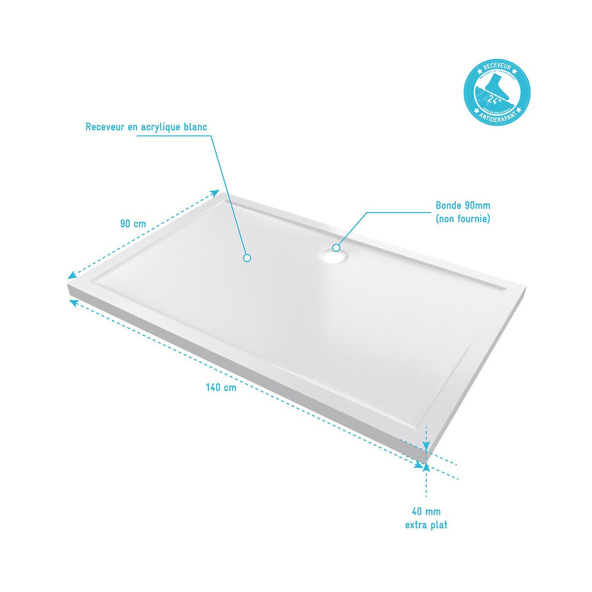 Caractéristiques techniques du receveur : Receveur en acrylique blanc Faible épaisseur : 4 cm À poser ou à encastrer dans le sol bonde 90 mm non fournie Dimensions du receveur : 140x90x4cm Garantie 2 ans pièces et non main d'oeuvre. Profilé noir mat thermolaqué : Le thermolaquage est une technique de traitement spécifique réservé aux matériaux en métal ou en aluminium brut. On projette de la peinture en poudre chargée en électricité statique qui va se déposer sur toute la surface des profilés. Cette technique de pulvérisation en poudre , qui s’appelle projection électrostatique ou poudrage électrostatique, permet d'avoir un revêtement complètement uniforme sur tous les profilés. Ce type de traitement dispense l’utilisation de produits chimiques nocifs pour la santé et l’environnement comme les solvants. Après avoir été recouverte de poudre, la pièce doit passer dans un four où elle sera chauffée pendant 20 minutes à 200°C. Les avantages du thermolaquage : Cette technique possède de nombreux avantage, qui sont La surface peinte possède une dureté supérieure ce qui a pour conséquence une résistance aux chocs accrue Le thermolaquage a une meilleure résistance à la corrosion La couleur des profilés thermolaqués résiste mieux au vieillisement et tout autres élément tel que l'humidité etc. Les profilés thermolaqués présentent une meilleure finition, fini les coulures de peinture et défauts d'aspect, avec cette technique la surface est uniforme Sans solvant c'est un véritable plus pour la santé Mais aussi plus écologique (pas de solvants) Dans un souci de qualité mais aussi de sécurité nos produits répondent à toutes les normes Européennes en vigeur. Que ce soit en terme de sécurité en cas de casse, d'entretien de nos produits ou de la durée de vie de ces derniers, nos produits remplissent tous les critères. Verre trempé : Le verre trempé est un verre qui a subi un traitement afin d’améliorer ses propriétés. Nous utilisons la trempe thermique qui consiste à porter le verre à très haute température (environ à 700 °C), puis de le refroidir rapidement. Ce processus favorise l'apparition de tensions en profondeur et celle de la compression à la surface du verre. Tout cela a pour effet l’amélioration de sa résistance aux chocs. Il est de 2 à 5 fois plus résistant que le verre simple. Mais aussi diminue grandement la dangerosité du verre car en cas de casse le verre explose en de petits morceaux et non pas en de grands pans tranchants. Pour le reste il conserve les mêmes propriétés que le verre classique Norme harmonisée : EN14428:2004 Certification Européenne: Aptitude au nettoyage : EN14428 :2004+A1:2008 Clause 4.2 Résistance à l’impact / Propriétés d’éclatement: EN14428:2004+A1:2008 Clause 4.3 Durabilité : EN14428:2004+A1:2008 Clause 4.4 MyShowerRoom c’est aussi la garantie de durabilité : Nous garantissons un stocks de pièces détachées d’au moins 5 ans Notre visserie est en acier inoxydable ce qui est une garantie anticorrosion Garantie 2 ans pièces uniquement Cocorico ! MyShowerRoom est une entreprise Française et toute la conception de nos produits est également Française. Ce qui est un véritable plus pour être au plus près de ses clients et avoir une meilleure connaissance de leurs attentes. Qui sommes nous L’HISTOIRE DE MYSHOWERROOM Nous avons créé MyShowerRoom en 2003 avec l’ambition de démocratiser le design et l’innovation dans la salle de bain pour faire de cette pièce un lieu à part entière, un véritable lieu d’histoires à vivre pour toute la famille. Nos cabines de douche et meubles de salle de bain dans l’ère du temps à des tarifs très accessibles. Nos nombreux brevets garantissent l’originalité de notre gamme de cabines de douches. Et nos ingénieurs mettent en œuvre tout leur savoir-faire et toutes les technologies innovantes au service d’une simplicité d’installation et d’utilisation incomparable pour tous. ÊTRE BIENVEILLANT AVEC NOS CLIENTS Notre service client a un objectif : rendre nos clients heureux. Pour cela nous veillons à répondre dans les 24h aux demandes clients. Mais aussi de toujours apporter une solution et entière satisfaction à nos clients. CONSTRUIRE DES PRODUITS TOUJOURS PLUS PERFORMANTS Nos ingénieurs, ainsi que nos équipes terrain consacrent tous leurs efforts à créer des produits adaptés à vos besoins, et toujours plus innovants grâce à nos technologies. Notre objectif est d’être votre unique interlocuteur pour tous vos projets de salle de bain. CONCRÉTISER LES RÊVES DE CHACUN Un projet de salle de bain ? Nous le réalisons ! Lieu de détente et de relaxation par excellence, la salle de bain est une des pièces maîtresse de la maison. Chez MyShowerRoom, nous mettons tout en oeuvre afin que ce rêve devienne réalité. PROPOSER UNE GAMME COMPLÈTE DE PRODUITS Nous vous proposons grâce à notre boutique en ligne une gamme complète de produits Made in MyShowerRoom pour équiper, et accessoiriser votre salle de bain. Un catalogue que nous renouvelons régulièrement avec les dernières technologies MyShowerRoom. APPORTER UNE EXPERTISE HUMAINE Parce que l’humain passe avant tout, nous travaillons avec les meilleurs experts. La satisfaction de nos clients est notre seule et unique priorité. Chaque problème a une solution, et c’est dans cette optique que nous avons mis en place un chat pour échanger directement avec nos équipes. NOTRE CENTRE LOGISTIQUE 11 000 m² d’entrepôt 7000 palettes en stock 1 800 colis traités par jour Plus de 260 préparations de commandes quotidiennes 12 quais de chargement/déchargement CONSEILS & VENTES Une équipe disponible 5 jours sur 7 pour vous accompagner dans vos achats. LIVRAISON GRATUITE Pour toute commande sur le site MyShowerRoom, la livraison est gratuite dans toute la France. UNE GARANTIE DE QUALITÉ Grâce à nos produits brevetés vous bénéfici