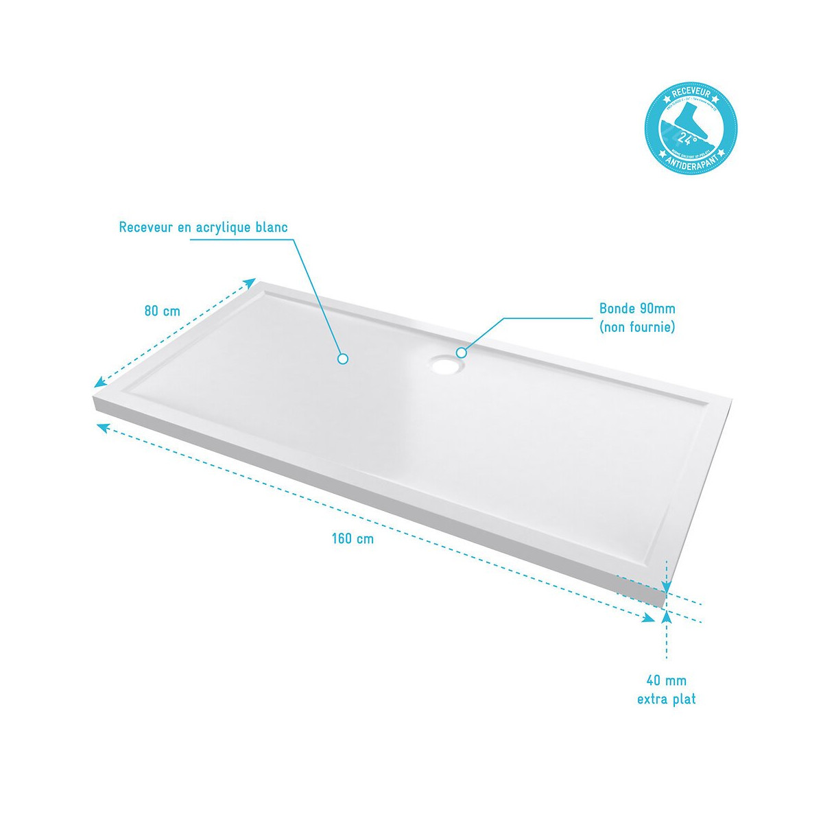 Caractéristique du receveur : Receveur en acrylique blanc Faible épaisseur : 4 cm À poser ou à encastrer dans le sol bonde 90 mm non fournie Dimensions du receveur : 160x80x4cm Garantie 2 ans pièces uniquement Cocorico ! MyShowerRoom est une entreprise Française et toute la conception de nos produits est également Française. Ce qui est un véritable plus pour être au plus près de ses clients et avoir une meilleure connaissance de leurs attentes. Qui sommes nous L’HISTOIRE DE MYSHOWERROOM Nous avons créé MyShowerRoom en 2003 avec l’ambition de démocratiser le design et l’innovation dans la salle de bain pour faire de cette pièce un lieu à part entière, un véritable lieu d’histoires à vivre pour toute la famille. Nos cabines de douche et meubles de salle de bain dans l’ère du temps à des tarifs très accessibles. Nos nombreux brevets garantissent l’originalité de notre gamme de cabines de douches. Et nos ingénieurs mettent en œuvre tout leur savoir-faire et toutes les technologies innovantes au service d’une simplicité d’installation et d’utilisation incomparable pour tous. ÊTRE BIENVEILLANT AVEC NOS CLIENTS Notre service client a un objectif : rendre nos clients heureux. Pour cela nous veillons à répondre dans les 24h aux demandes clients. Mais aussi de toujours apporter une solution et entière satisfaction à nos clients. CONSTRUIRE DES PRODUITS TOUJOURS PLUS PERFORMANTS Nos ingénieurs, ainsi que nos équipes terrain consacrent tous leurs efforts à créer des produits adaptés à vos besoins, et toujours plus innovants grâce à nos technologies. Notre objectif est d’être votre unique interlocuteur pour tous vos projets de salle de bain. CONCRÉTISER LES RÊVES DE CHACUN Un projet de salle de bain ? Nous le réalisons ! Lieu de détente et de relaxation par excellence, la salle de bain est une des pièces maîtresse de la maison. Chez MyShowerRoom, nous mettons tout en oeuvre afin que ce rêve devienne réalité. PROPOSER UNE GAMME COMPLÈTE DE PRODUITS Nous vous proposons grâce à notre boutique en ligne une gamme complète de produits Made in MyShowerRoom pour équiper, et accessoiriser votre salle de bain. Un catalogue que nous renouvelons régulièrement avec les dernières technologies MyShowerRoom. APPORTER UNE EXPERTISE HUMAINE Parce que l’humain passe avant tout, nous travaillons avec les meilleurs experts. La satisfaction de nos clients est notre seule et unique priorité. Chaque problème a une solution, et c’est dans cette optique que nous avons mis en place un chat pour échanger directement avec nos équipes. NOTRE CENTRE LOGISTIQUE 11 000 m² d’entrepôt 7000 palettes en stock 1 800 colis traités par jour Plus de 260 préparations de commandes quotidiennes 12 quais de chargement/déchargement CONSEILS & VENTES Une équipe disponible 5 jours sur 7 pour vous accompagner dans vos achats. LIVRAISON GRATUITE Pour toute commande sur le site MyShowerRoom, la livraison est gratuite dans toute la France. UNE GARANTIE DE QUALITÉ Grâce à nos produits brevetés vous bénéficiez de produits uniques. Référence produit: FAC378 Retrouvez plus d'informations produit et des conseils de montage sur le site Aurlane. Remarques importantes: Ces colis sont volumineux, la livraison est effectuée par transporteur spécialisé en bas de chez vous. Les chauffeurs ne sont pas habilités à porter la marchandise, mais uniquement à la décharger. Pas de livraison à l'étage. L'adresse de livraison doit être accessible en camion poids lourd. Dans le cas contraire la marchandise sera mise à disposition au dépôt le plus proche (distance non garantie). Les rendez-vous sont gérés directement par les transporteurs. Attention à bien contrôler la marchandise à réception pour éviter tous litiges.
