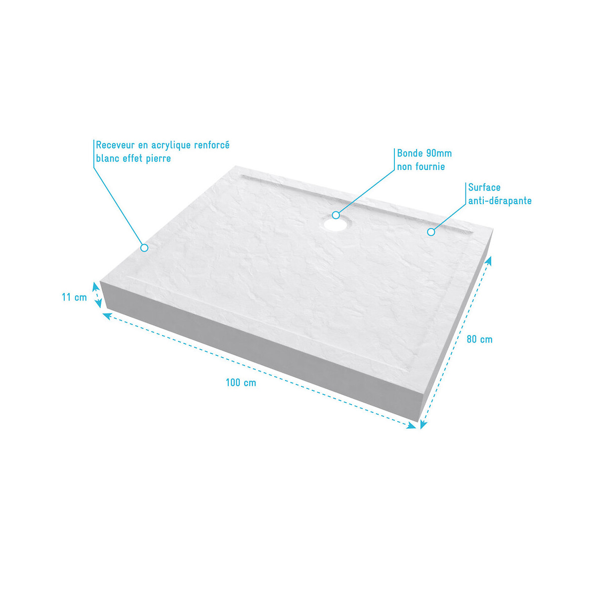 Caractéristiques du produit : Receveur en acrylique renforcé blanc effet pierre Bonde 90mm non fournie Surface anti-dérapante Dimensions du receveur : 100x80x11 cm Garantie 2 ans pièces uniquement Cocorico ! MyShowerRoom est une entreprise Française et toute la conception de nos produits est également Française. Ce qui est un véritable plus pour être au plus près de ses clients et avoir une meilleure connaissance de leurs attentes. Qui sommes nous L’HISTOIRE DE MYSHOWERROOM Nous avons créé MyShowerRoom en 2003 avec l’ambition de démocratiser le design et l’innovation dans la salle de bain pour faire de cette pièce un lieu à part entière, un véritable lieu d’histoires à vivre pour toute la famille. Nos cabines de douche et meubles de salle de bain dans l’ère du temps à des tarifs très accessibles. Nos nombreux brevets garantissent l’originalité de notre gamme de cabines de douches. Et nos ingénieurs mettent en œuvre tout leur savoir-faire et toutes les technologies innovantes au service d’une simplicité d’installation et d’utilisation incomparable pour tous. ÊTRE BIENVEILLANT AVEC NOS CLIENTS Notre service client a un objectif : rendre nos clients heureux. Pour cela nous veillons à répondre dans les 24h aux demandes clients. Mais aussi de toujours apporter une solution et entière satisfaction à nos clients. CONSTRUIRE DES PRODUITS TOUJOURS PLUS PERFORMANTS Nos ingénieurs, ainsi que nos équipes terrain consacrent tous leurs efforts à créer des produits adaptés à vos besoins, et toujours plus innovants grâce à nos technologies. Notre objectif est d’être votre unique interlocuteur pour tous vos projets de salle de bain. CONCRÉTISER LES RÊVES DE CHACUN Un projet de salle de bain ? Nous le réalisons ! Lieu de détente et de relaxation par excellence, la salle de bain est une des pièces maîtresse de la maison. Chez MyShowerRoom, nous mettons tout en oeuvre afin que ce rêve devienne réalité. PROPOSER UNE GAMME COMPLÈTE DE PRODUITS Nous vous proposons grâce à notre boutique en ligne une gamme complète de produits Made in MyShowerRoom pour équiper, et accessoiriser votre salle de bain. Un catalogue que nous renouvelons régulièrement avec les dernières technologies MyShowerRoom. APPORTER UNE EXPERTISE HUMAINE Parce que l’humain passe avant tout, nous travaillons avec les meilleurs experts. La satisfaction de nos clients est notre seule et unique priorité. Chaque problème a une solution, et c’est dans cette optique que nous avons mis en place un chat pour échanger directement avec nos équipes. NOTRE CENTRE LOGISTIQUE 11 000 m² d’entrepôt 7000 palettes en stock 1 800 colis traités par jour Plus de 260 préparations de commandes quotidiennes 12 quais de chargement/déchargement CONSEILS & VENTES Une équipe disponible 5 jours sur 7 pour vous accompagner dans vos achats. LIVRAISON GRATUITE Pour toute commande sur le site MyShowerRoom, la livraison est gratuite dans toute la France. UNE GARANTIE DE QUALITÉ Grâce à nos produits brevetés vous bénéficiez de produits uniques. Référence produit: FAC308 Retrouvez plus d'informations produit et des conseils de montage sur le site Aurlane. Remarques importantes: Ces colis sont volumineux, la livraison est effectuée par transporteur spécialisé en bas de chez vous. Les chauffeurs ne sont pas habilités à porter la marchandise, mais uniquement à la décharger. Pas de livraison à l'étage. L'adresse de livraison doit être accessible en camion poids lourd. Dans le cas contraire la marchandise sera mise à disposition au dépôt le plus proche (distance non garantie). Les rendez-vous sont gérés directement par les transporteurs. Attention à bien contrôler la marchandise à réception pour éviter tous litiges.
