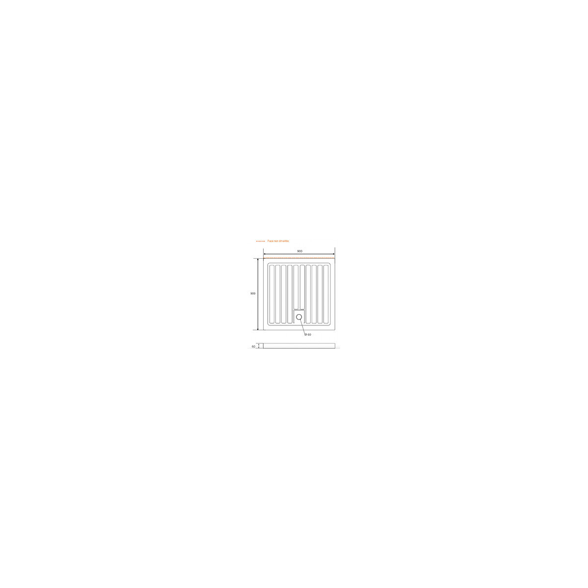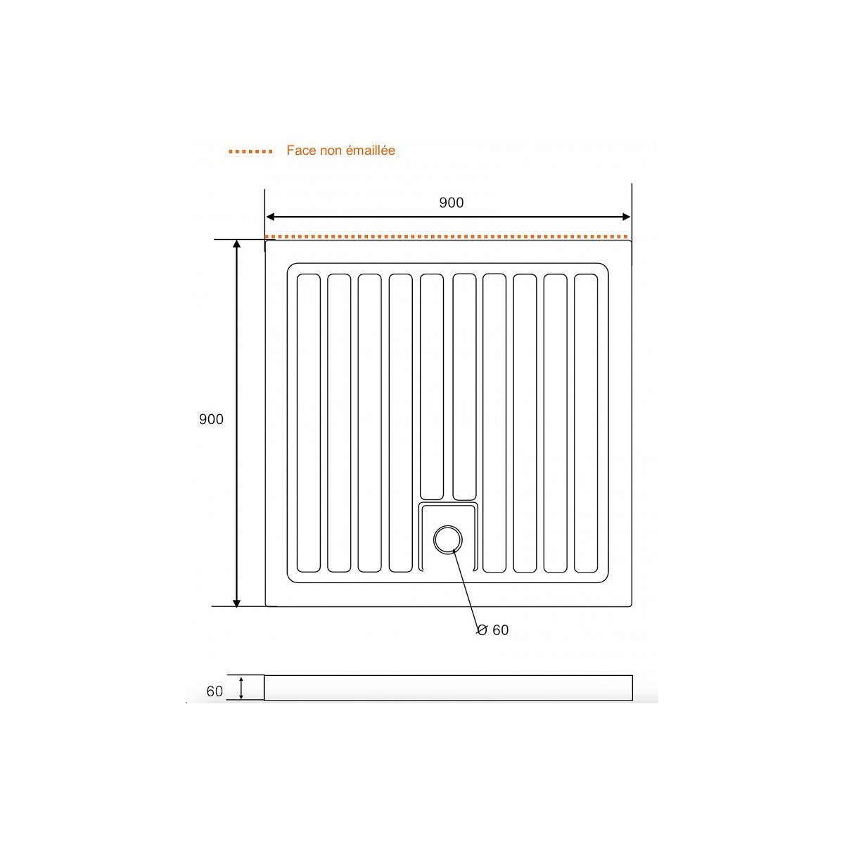 Receveur extra plat à poser carré Dimensions : 90x90 cm Ce receveur est en grès blanc Trou de bonde D60 mm Livré sans bonde Fond rainuré, finition 3 faces émaillées, 1 face non émaillée (Côté opposé au trou de bonde, à poser dans le sens de présentation de la photo) Cache bonde amovible grille inox