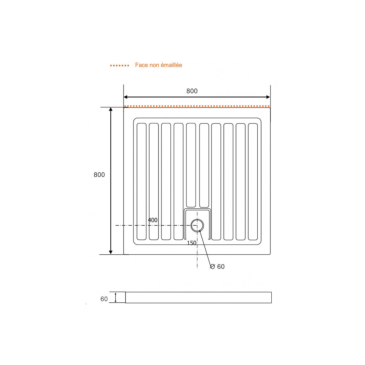 Receveur extra plat à poser carre 80x80 en grès blanc Trou de bonde Diamètre 60 mm Fond rainuré, finition 3 faces émaillées, 1 face non émaillée (Côté opposé au trou de bond, à poser dans le sens de la photo) Cache bonde amovible grille inox - Livré sans bonde