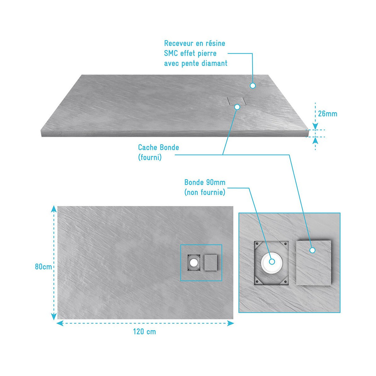 Caractéristiques Receveur en résine SMC effet pierre Finition ardoise gris mat Pente diamant Épaisseur 25mm Cache bonde fourni Bonde 90mm non fournie Dimensions 120x80cm Les plus produit: Receveur en SMC ultra résistant et imputrescible Superbe finition effet pierre Cache bonde fourni pour une finition parfaite et un beau design Installation facile Garantie 2 ans pièces et non main d'oeuvre. Profilé noir mat thermolaqué : Le thermolaquage est une technique de traitement spécifique réservé aux matériaux en métal ou en aluminium brut. On projette de la peinture en poudre chargée en électricité statique qui va se déposer sur toute la surface des profilés. Cette technique de pulvérisation en poudre , qui s’appelle projection électrostatique ou poudrage électrostatique, permet d'avoir un revêtement complètement uniforme sur tous les profilés. Ce type de traitement dispense l’utilisation de produits chimiques nocifs pour la santé et l’environnement comme les solvants. Après avoir été recouverte de poudre, la pièce doit passer dans un four où elle sera chauffée pendant 20 minutes à 200°C. Les avantages du thermolaquage : Cette technique possède de nombreux avantage, qui sont La surface peinte possède une dureté supérieure ce qui a pour conséquence une résistance aux chocs accrue Le thermolaquage a une meilleure résistance à la corrosion La couleur des profilés thermolaqués résiste mieux au vieillisement et tout autres élément tel que l'humidité etc. Les profilés thermolaqués présentent une meilleure finition, fini les coulures de peinture et défauts d'aspect, avec cette technique la surface est uniforme Sans solvant c'est un véritable plus pour la santé Mais aussi plus écologique (pas de solvants) Dans un souci de qualité mais aussi de sécurité nos produits répondent à toutes les normes Européennes en vigeur. Que ce soit en terme de sécurité en cas de casse, d'entretien de nos produits ou de la durée de vie de ces derniers, nos produits remplissent tous les critères. Verre trempé : Le verre trempé est un verre qui a subi un traitement afin d’améliorer ses propriétés. Nous utilisons la trempe thermique qui consiste à porter le verre à très haute température (environ à 700 °C), puis de le refroidir rapidement. Ce processus favorise l'apparition de tensions en profondeur et celle de la compression à la surface du verre. Tout cela a pour effet l’amélioration de sa résistance aux chocs. Il est de 2 à 5 fois plus résistant que le verre simple. Mais aussi diminue grandement la dangerosité du verre car en cas de casse le verre explose en de petits morceaux et non pas en de grands pans tranchants. Pour le reste il conserve les mêmes propriétés que le verre classique Norme harmonisée : EN14428:2004 Certification Européenne: Aptitude au nettoyage : EN14428 :2004+A1:2008 Clause 4.2 Résistance à l’impact / Propriétés d’éclatement: EN14428:2004+A1:2008 Clause 4.3 Durabilité : EN14428:2004+A1:2008 Clause 4.4 MyShowerRoom c’est aussi la garantie de durabilité : Nous garantissons un stocks de pièces détachées d’au moins 5 ans Notre visserie est en acier inoxydable ce qui est une garantie anticorrosion Garantie 2 ans pièces uniquement Cocorico ! MyShowerRoom est une entreprise Française et toute la conception de nos produits est également Française. Ce qui est un véritable plus pour être au plus près de ses clients et avoir une meilleure connaissance de leurs attentes. Qui sommes nous L’HISTOIRE DE MYSHOWERROOM Nous avons créé MyShowerRoom en 2003 avec l’ambition de démocratiser le design et l’innovation dans la salle de bain pour faire de cette pièce un lieu à part entière, un véritable lieu d’histoires à vivre pour toute la famille. Nos cabines de douche et meubles de salle de bain dans l’ère du temps à des tarifs très accessibles. Nos nombreux brevets garantissent l’originalité de notre gamme de cabines de douches. Et nos ingénieurs mettent en œuvre tout leur savoir-faire et toutes les technologies innovantes au service d’une simplicité d’installation et d’utilisation incomparable pour tous. ÊTRE BIENVEILLANT AVEC NOS CLIENTS Notre service client a un objectif : rendre nos clients heureux. Pour cela nous veillons à répondre dans les 24h aux demandes clients. Mais aussi de toujours apporter une solution et entière satisfaction à nos clients. CONSTRUIRE DES PRODUITS TOUJOURS PLUS PERFORMANTS Nos ingénieurs, ainsi que nos équipes terrain consacrent tous leurs efforts à créer des produits adaptés à vos besoins, et toujours plus innovants grâce à nos technologies. Notre objectif est d’être votre unique interlocuteur pour tous vos projets de salle de bain. CONCRÉTISER LES RÊVES DE CHACUN Un projet de salle de bain ? Nous le réalisons ! Lieu de détente et de relaxation par excellence, la salle de bain est une des pièces maîtresse de la maison. Chez MyShowerRoom, nous mettons tout en oeuvre afin que ce rêve devienne réalité. PROPOSER UNE GAMME COMPLÈTE DE PRODUITS Nous vous proposons grâce à notre boutique en ligne une gamme complète de produits Made in MyShowerRoom pour équiper, et accessoiriser votre salle de bain. Un catalogue que nous renouvelons régulièrement avec les dernières technologies MyShowerRoom. APPORTER UNE EXPERTISE HUMAINE Parce que l’humain passe avant tout, nous travaillons avec les meilleurs experts. La satisfaction de nos clients est notre seule et unique priorité. Chaque problème a une solution, et c’est dans cette optique que nous avons mis en place un chat pour échanger directement avec nos équipes. NOTRE CENTRE LOGISTIQUE 11 000 m² d’entrepôt 7000 palettes en stock 1 800 colis traités par jour Plus de 260 préparations de commandes quotidiennes 12 quais de chargement/déchargement CONSEILS & VENTES Une équipe disponible 5 jours sur 7 pour vous accompagner dans vos achats. LIVRAISON GRATUITE Pour 